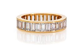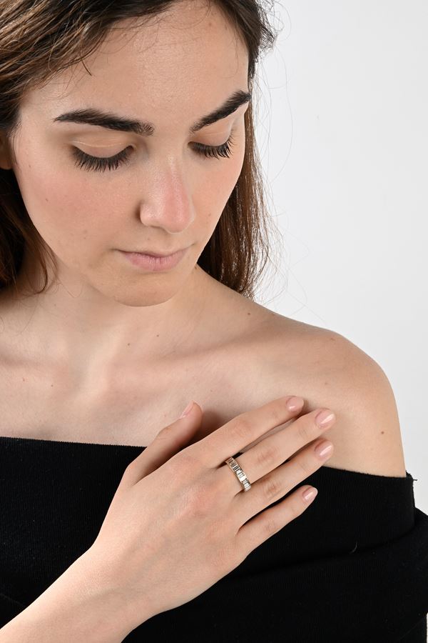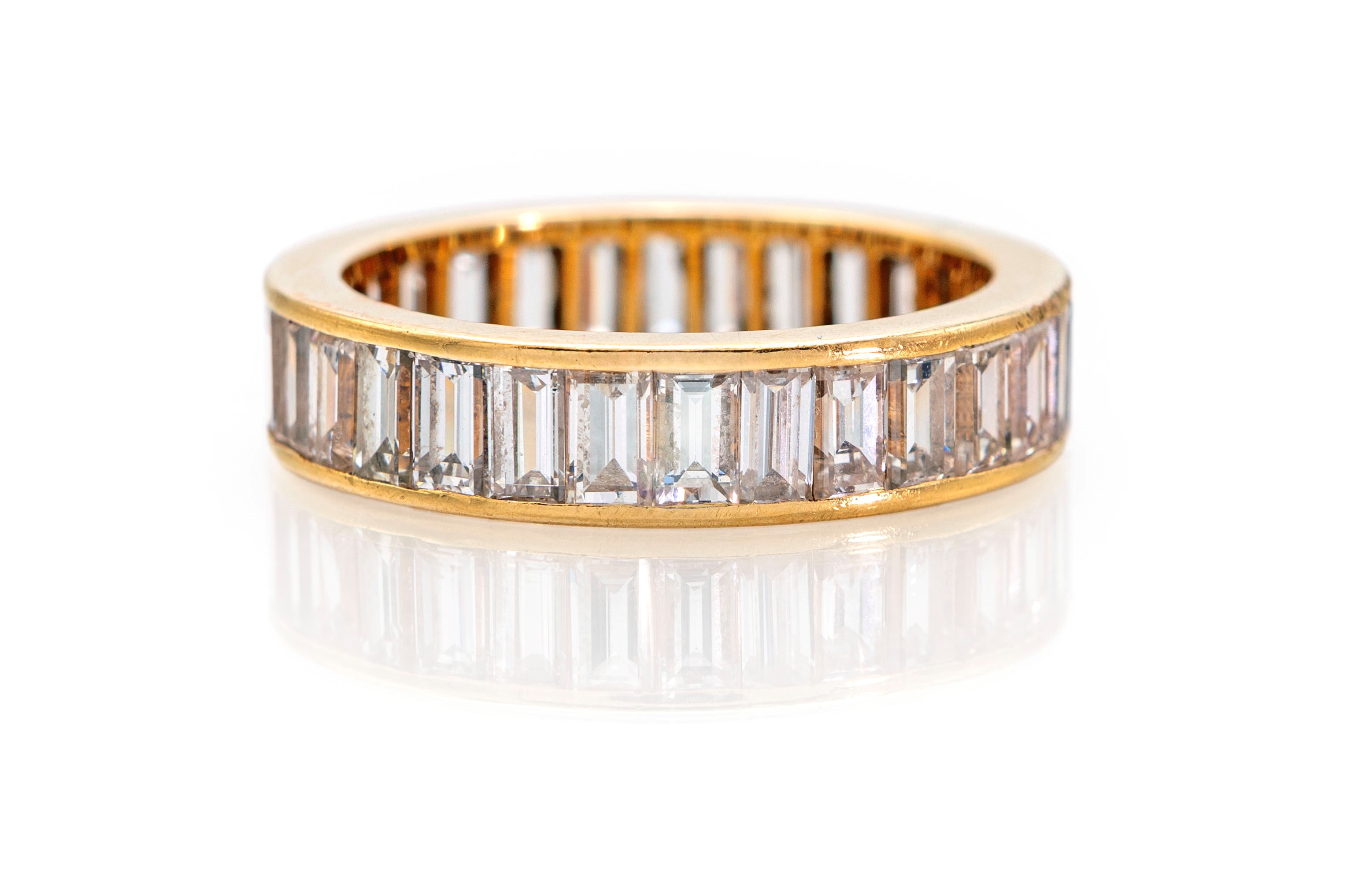 Oro giallo 750/000. Diamanti in taglio a gradini ct. 3 ca, prob G, VVS-VS. Peso complessivo gr. 4