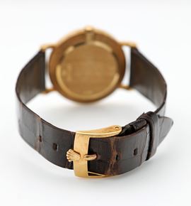 Oro giallo 750/000. Ref. n° 5112, cassa N° E 974496, fondello a scatto. Fibbia Rolex in oro. Quadrante dorato, indici applicati, secondi al centro. Movimento calibro 1601, 20 rubini, bilanciere monometallico, spirale piana.