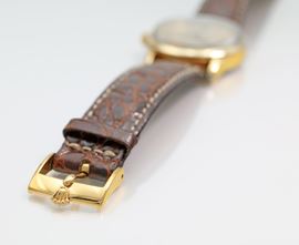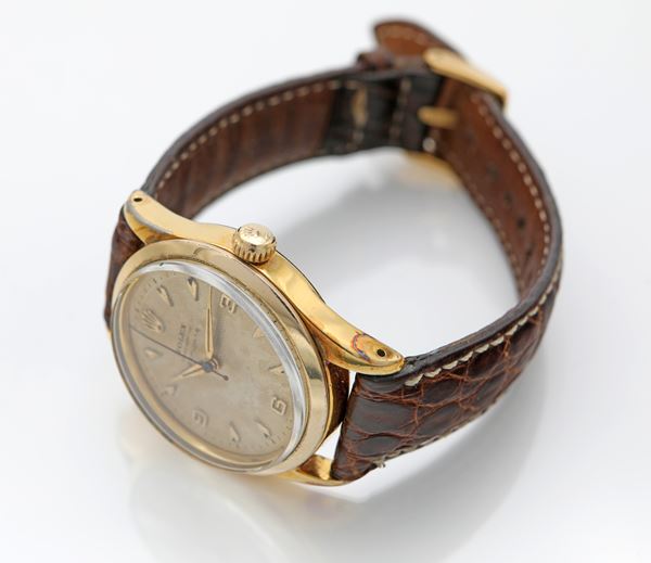 Acciaio laminato in oro. Ref. n° 5506, cassa laminata in oro N° 465713, fondello a vite. Fibbia Rolex placcata in oro. Quadrante argentato a nido d'ape, indici e numeri 3, 6 e 9 applicati, secondi al centro. Movimento automatico, calibro 1530, 25 rubini, bilanciere monometallico, spirale piana