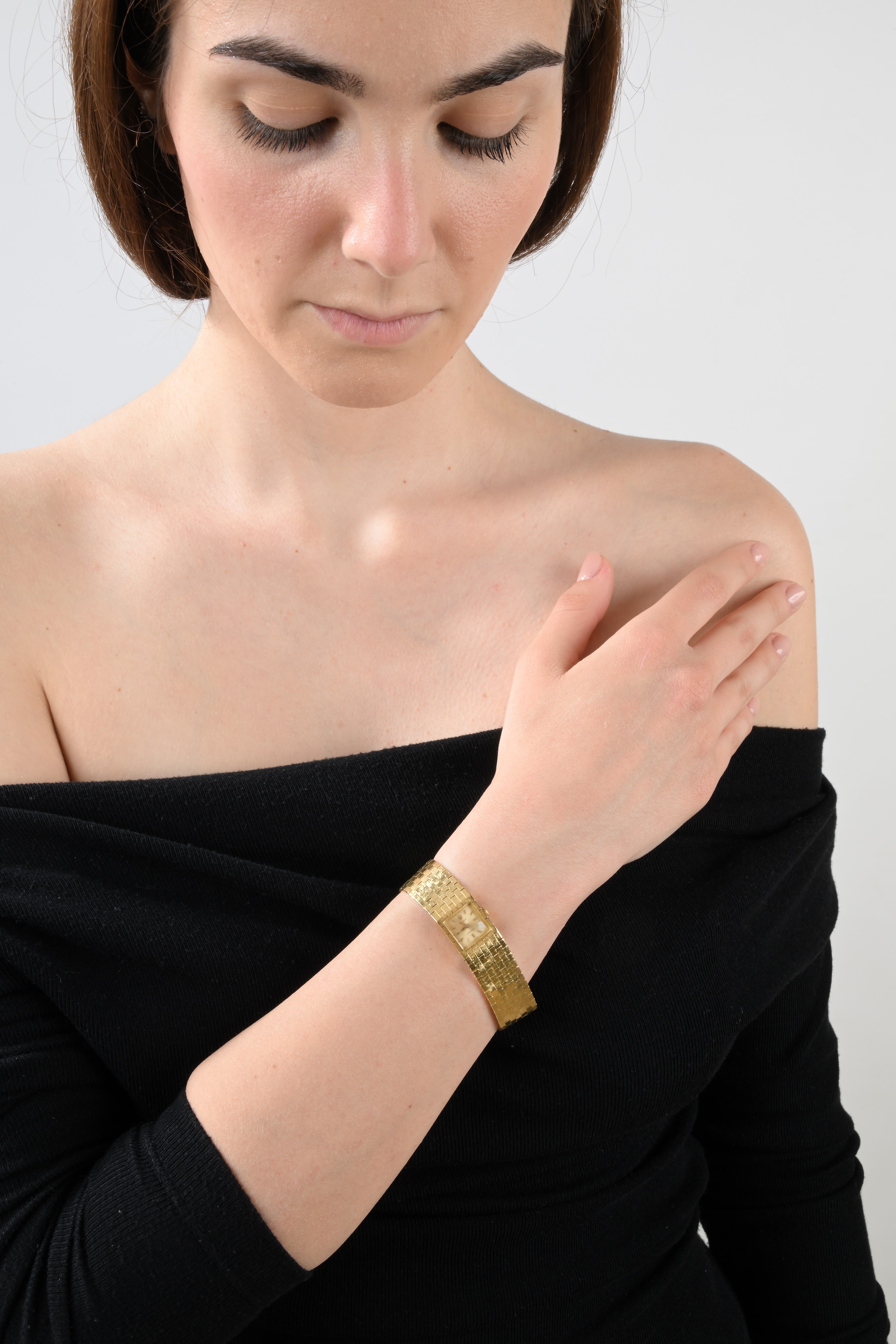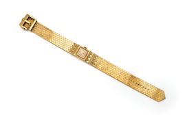 Oro giallo 750/000. Ref. n° 8209. Cassa n° 312603, fondello a scatto. Bracciale incorporato in oro 750/000 a foggia di cintura con passante. Quadrante dorè, indici applicati. Movimento calibro 1400, 18 rubini. Bilanciere monometallico con viti. Peso complessivo gr. 61,50.