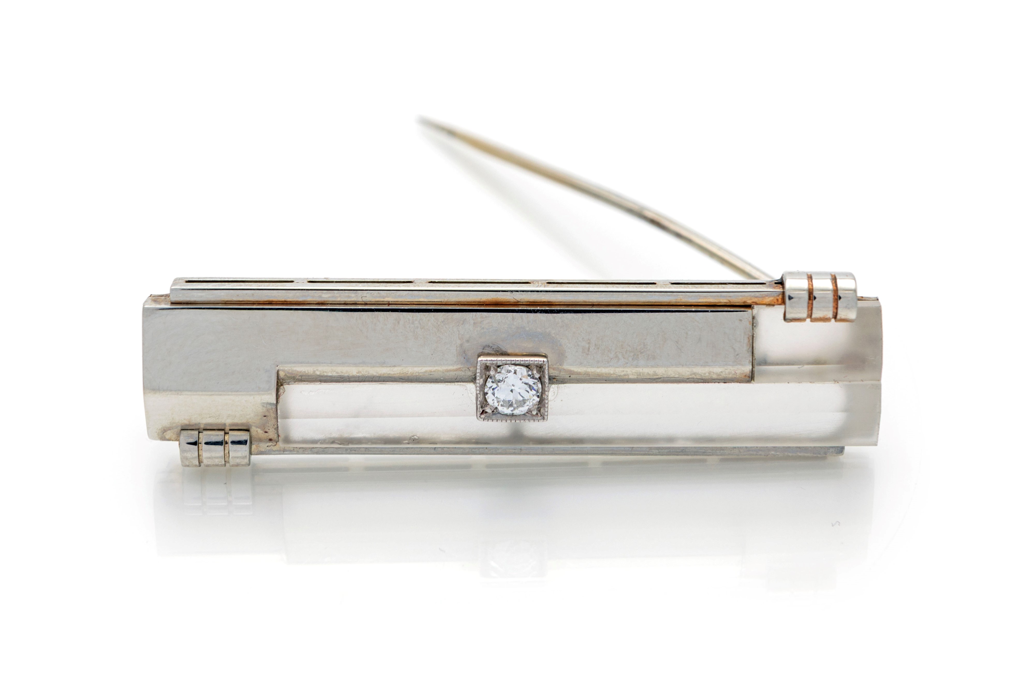 Spilla a barretta decò in oro, cristallo di rocca e brillante centrale