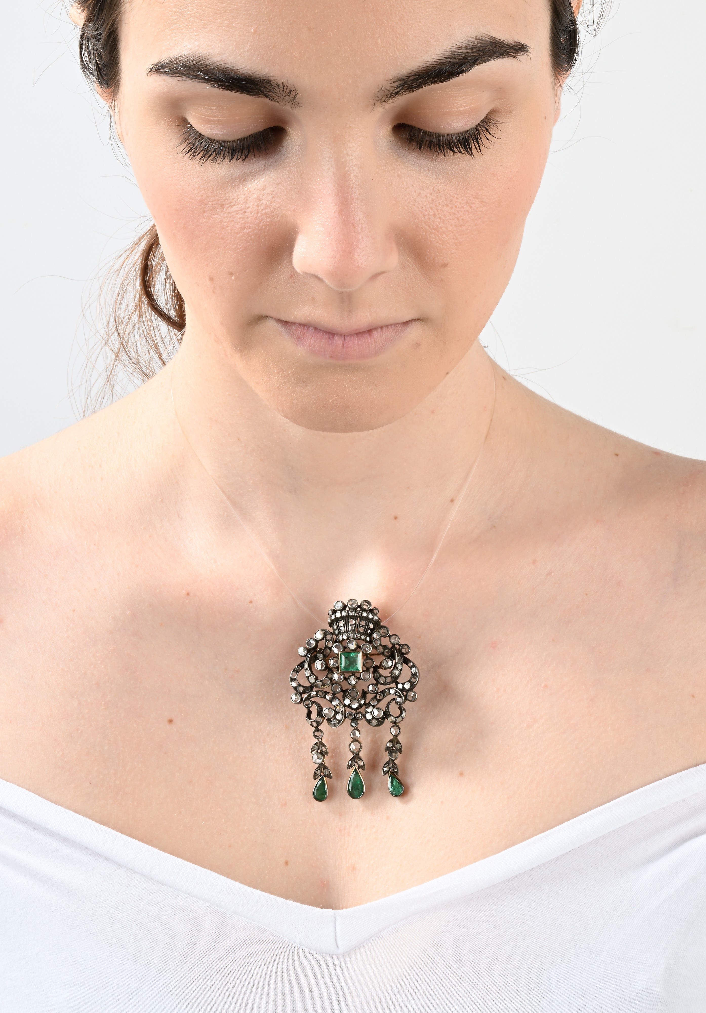 Spilla pendente antica in oro, argento, diamanti e smeraldi, Primi XIX secolo