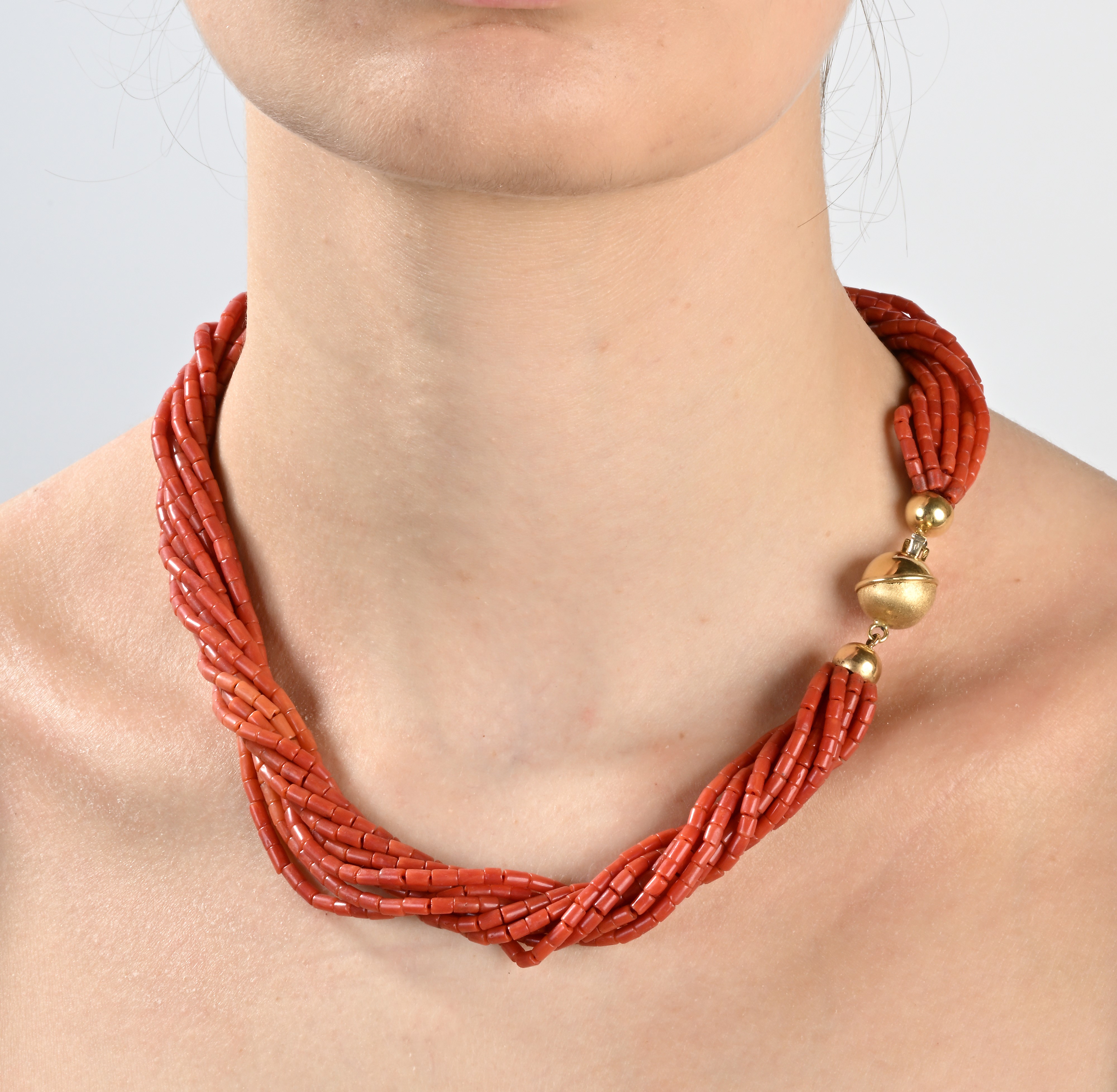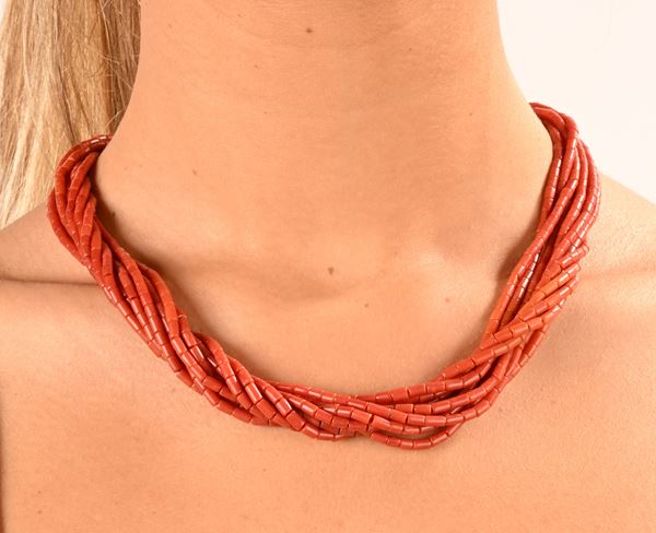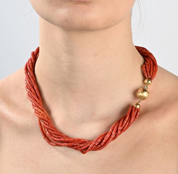 Oro giallo 750/000, corallo rosso in taglio barilotto liscio. Peso complessivo gr. 76,10