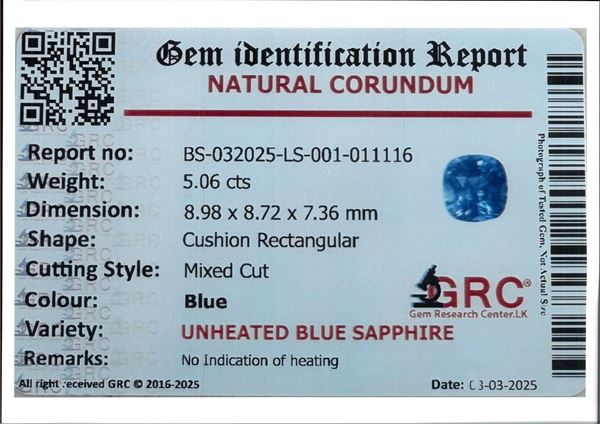 Zaffiro in taglio cuscino ct. 5,06, SENZA INDICAZIONE DI TRATTAMENTO TERMICO. Corredato di certificazione gemmologica Gem Identification Report.