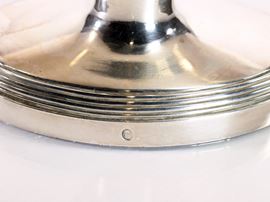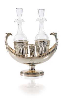 bottiglie di diversa misura con tappo poliedrico trattenute da ringhierina traforata ad archetti neogotici; piede ovale con profilo percorso da sottoli nervature