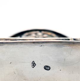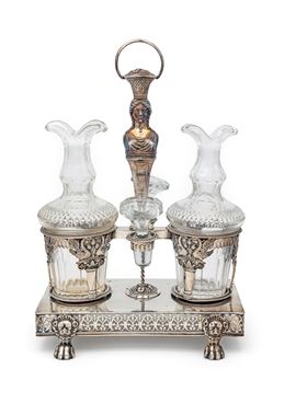 vassoio rettangolare con fascia traforata, sorretto da grandi piedi ferini con protomi leonine; due ampolle con alloggi a tripode caratterizzati da cigni contrapposti fra vegetazione palustre; presa centrale con figure bifronte di cariatide sulla cui testa una cesta di fiori funge da sostegno per la presa