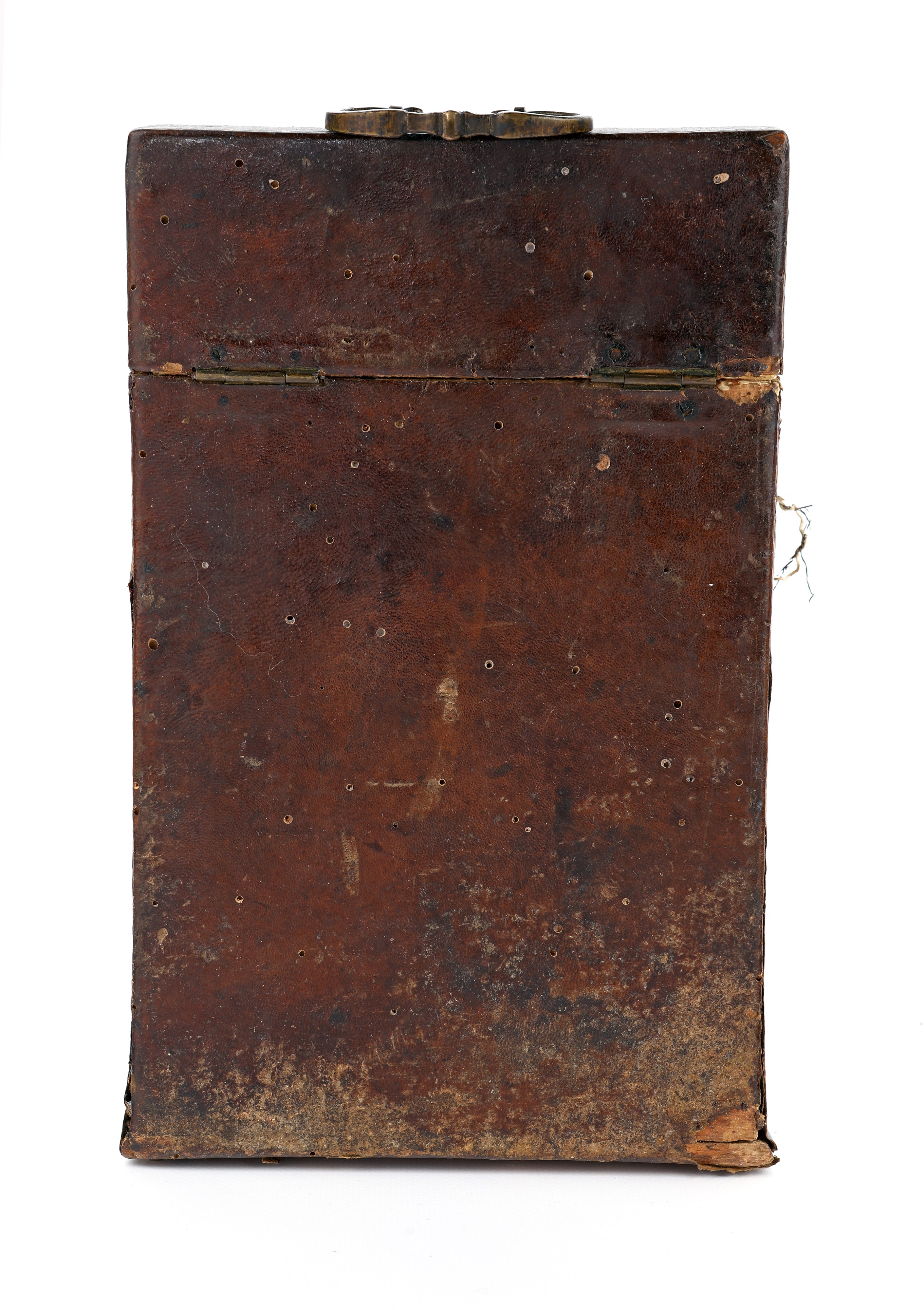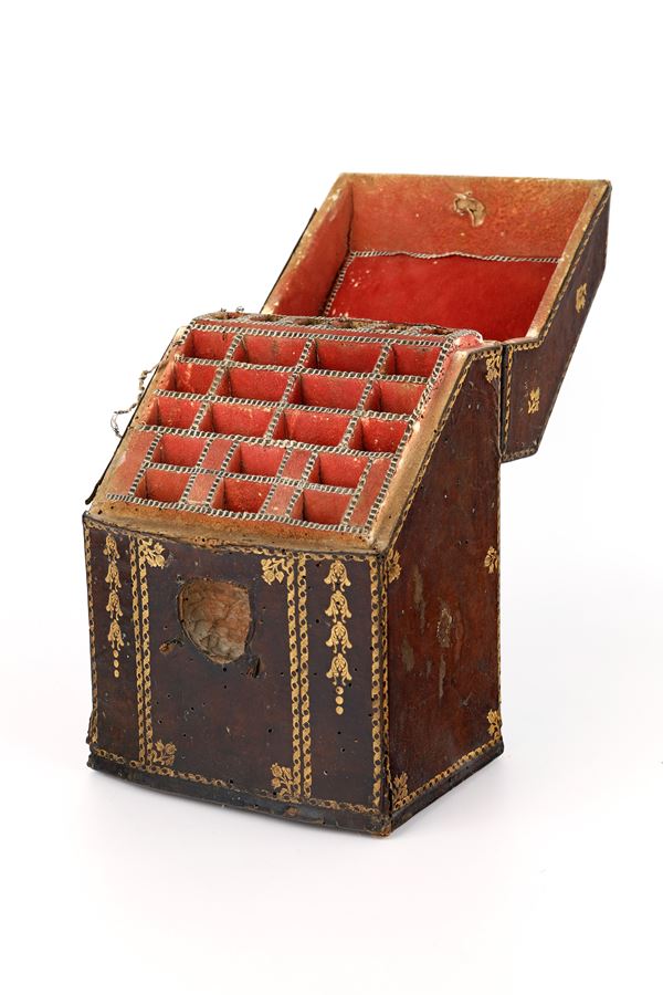 Antico cofanetto porta posate in legno rivestito in cuoio con stemma marchionale ed impressioni dorate