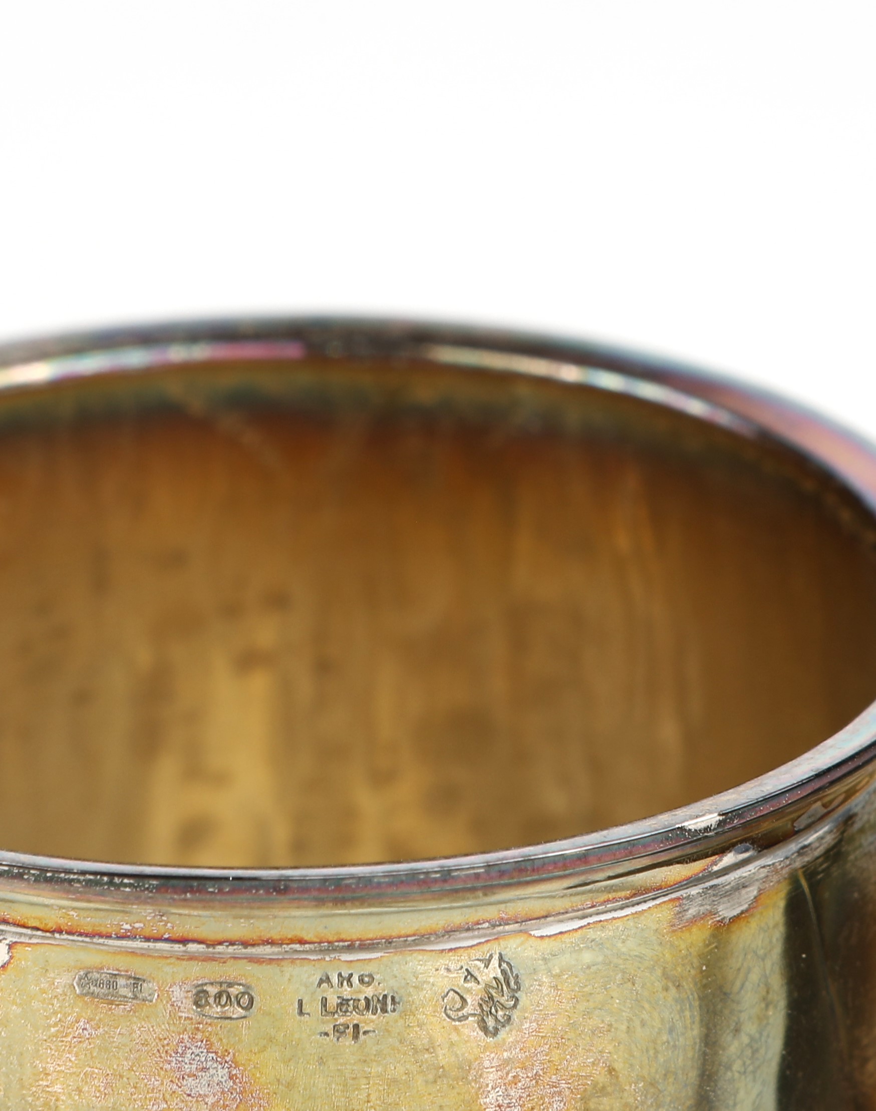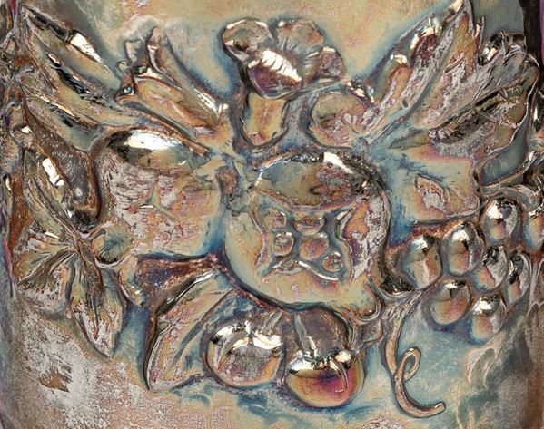 corpo cilindrico caratterizzato da una composizione sbalzata di melagrane, ciliegie, fragole, uva e fiori; manico a nastro