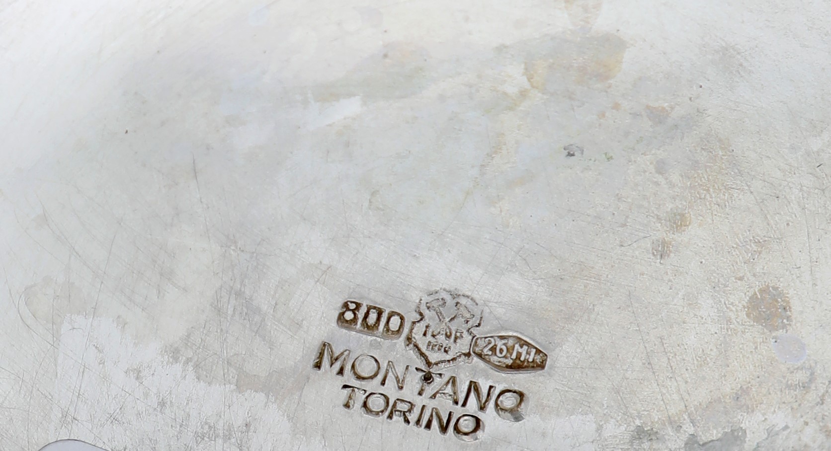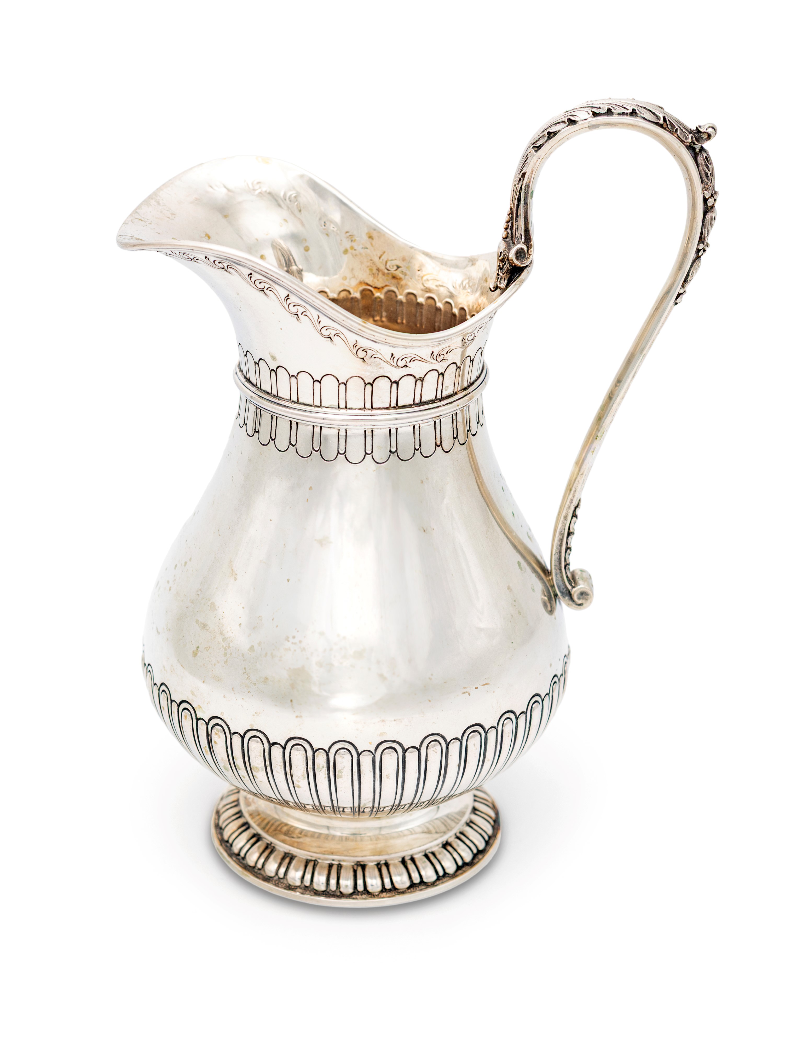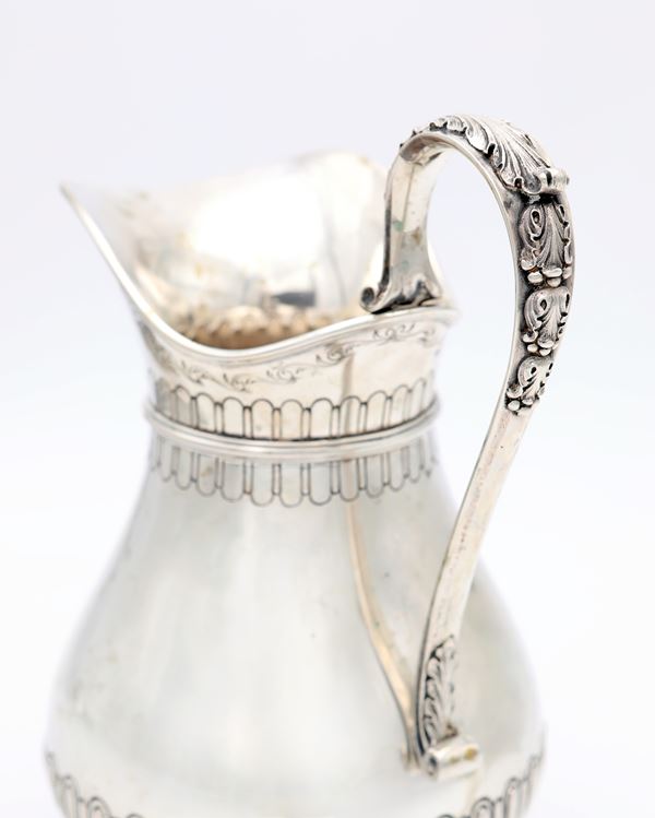 corpo ad anfora con parte inferiore segnata da sottili costolature, versatoio svasato, manico sagomato arricchito da un lungo rilievo vegetale cesellato applicato, basso piede circolare