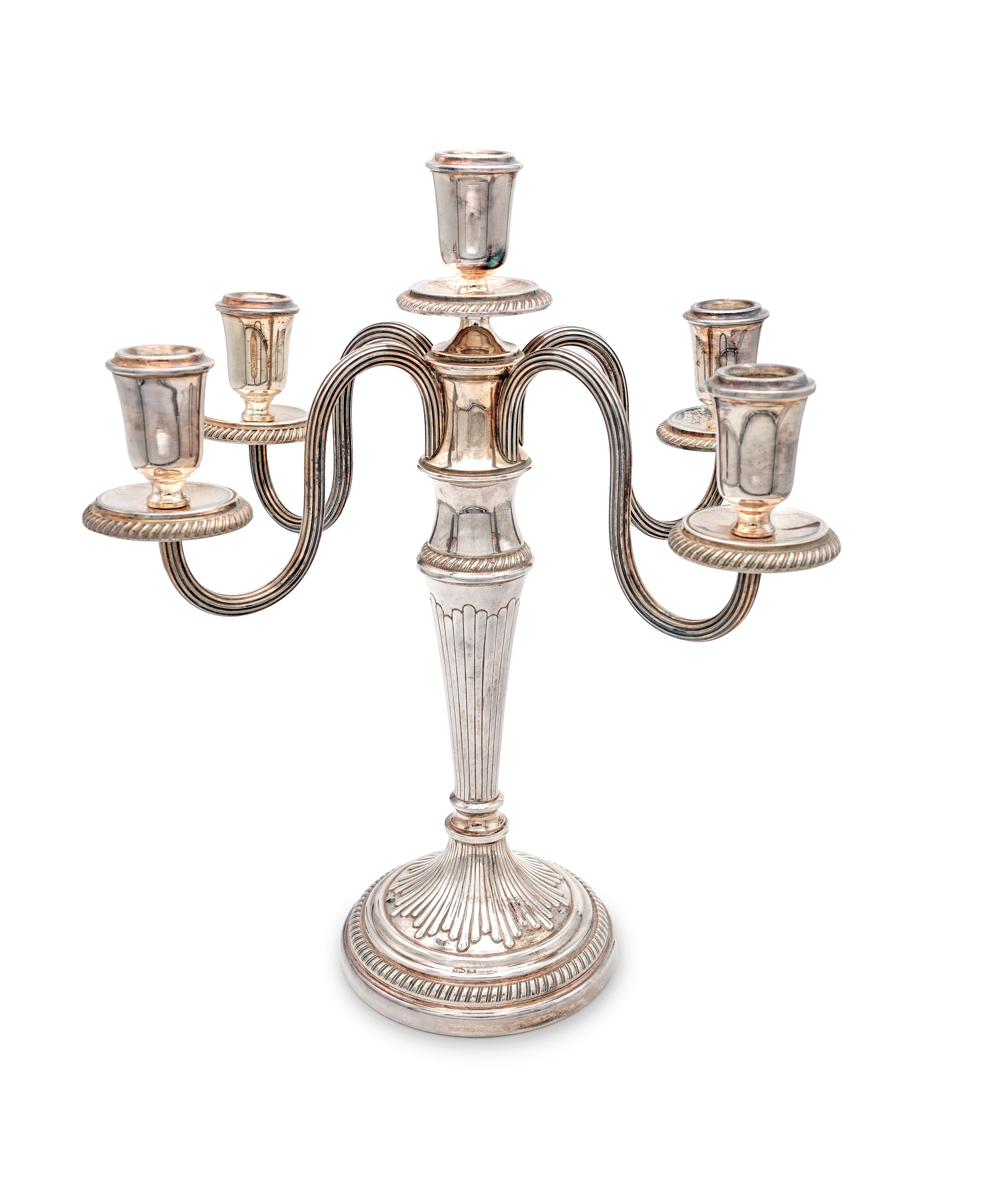 fusto rastremato da cui si dipartono quattro bracci incurvati con portacandela a vaso; piede circolare