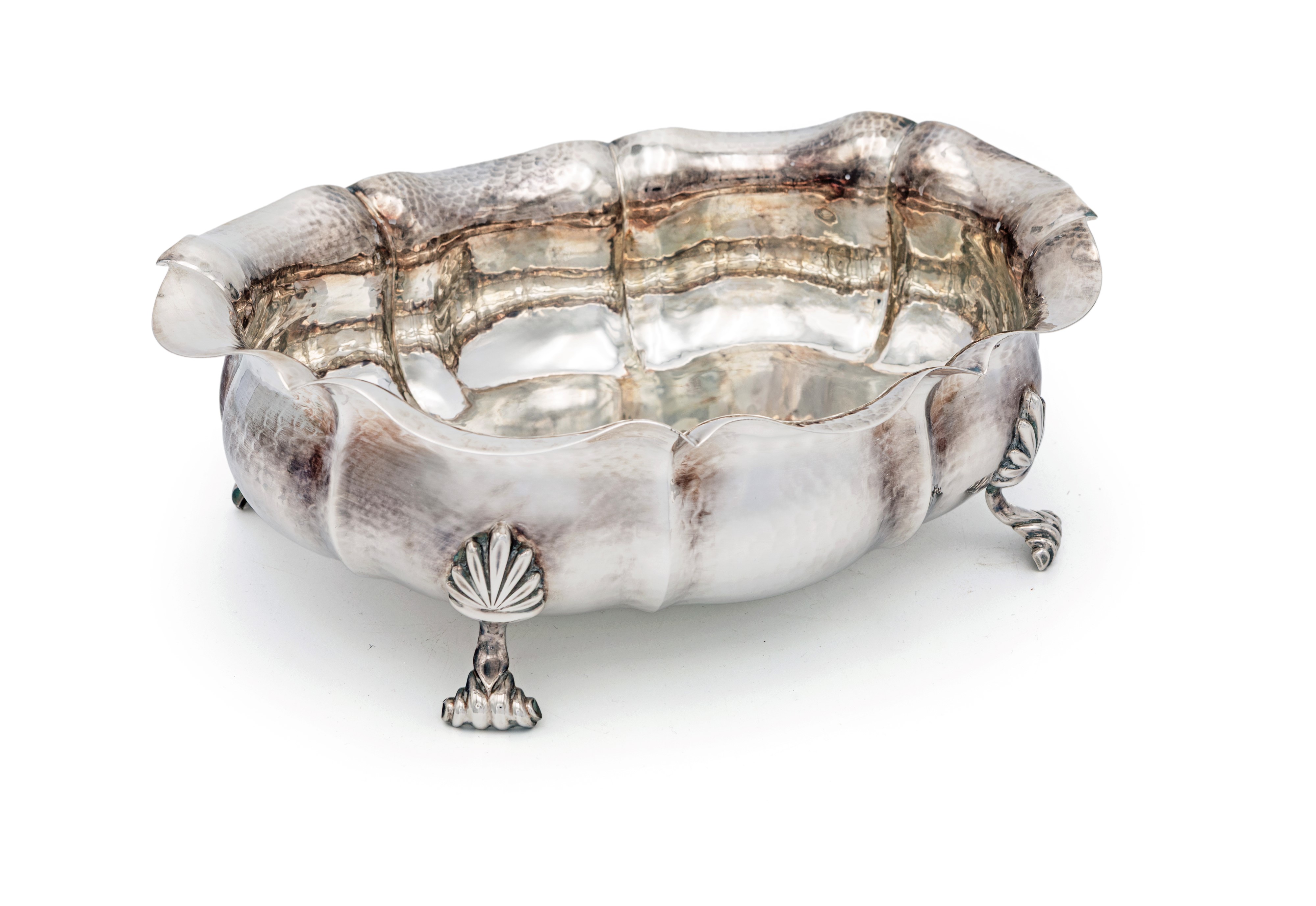forma ovale con orlo sagomato e ondulato; piedi incurvati con estremità a ricciolo ed attacco a palmetta