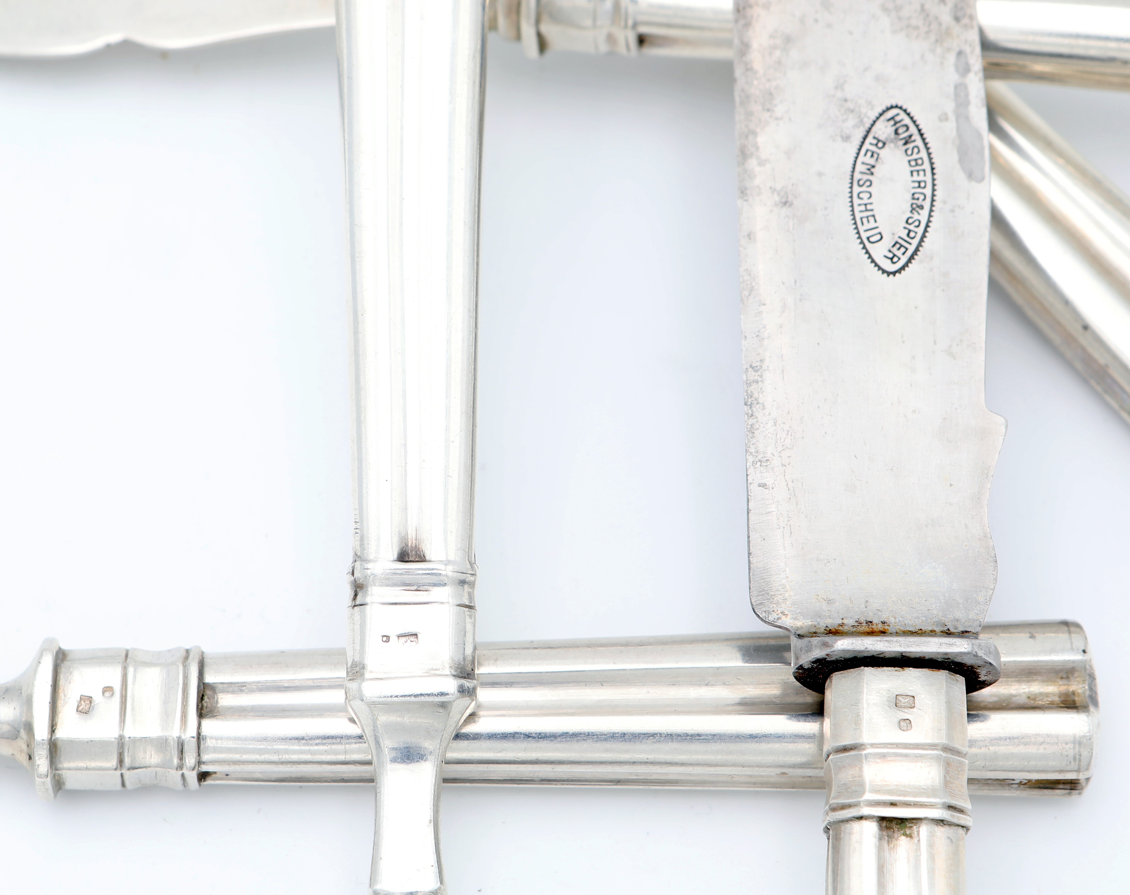 coltello e forchetta da arrosto, coltello e forchetta da pesce, paletta da dolce. Il coltello da arrosto con lama a sciabola della Honsberg & Spier Remscheid