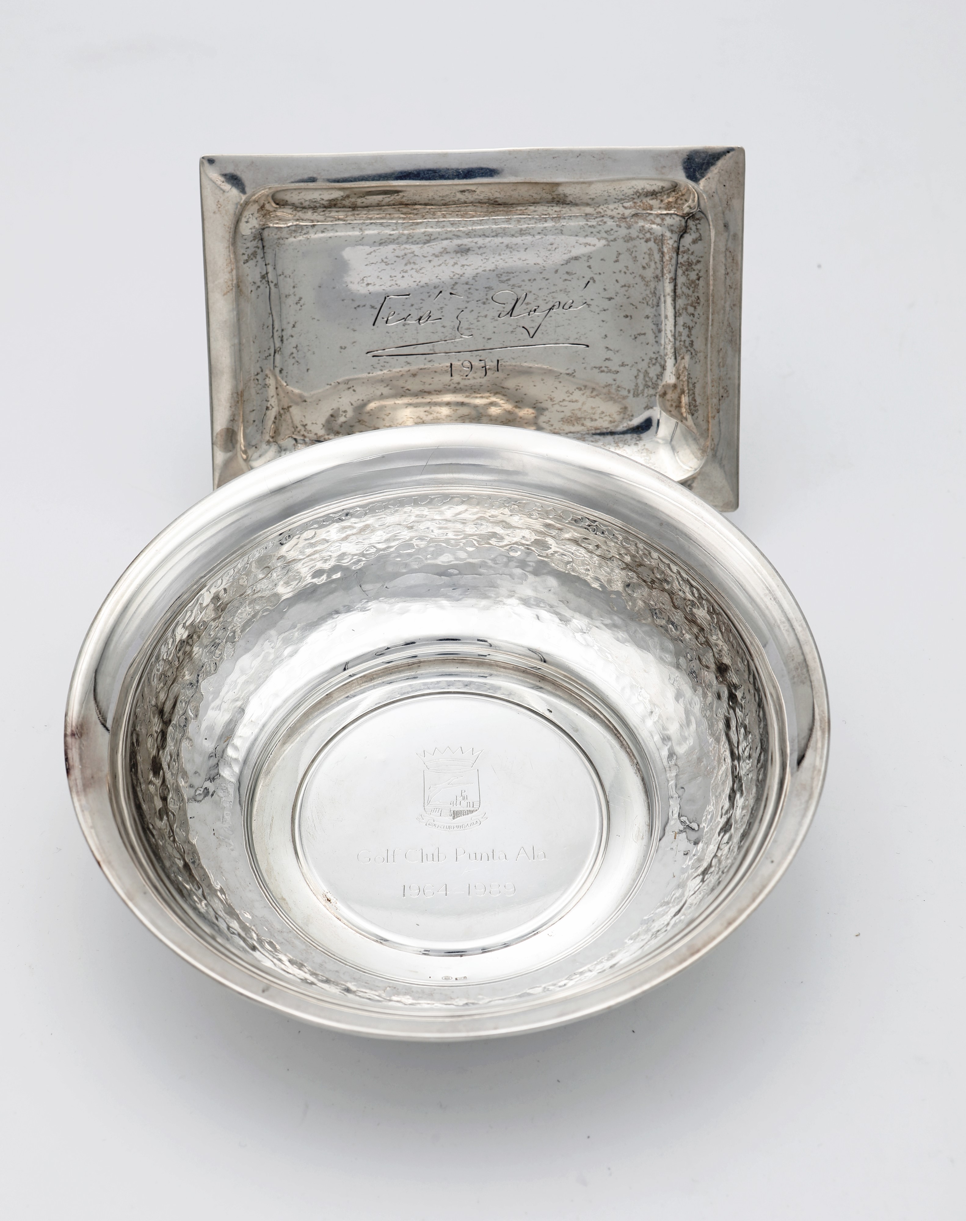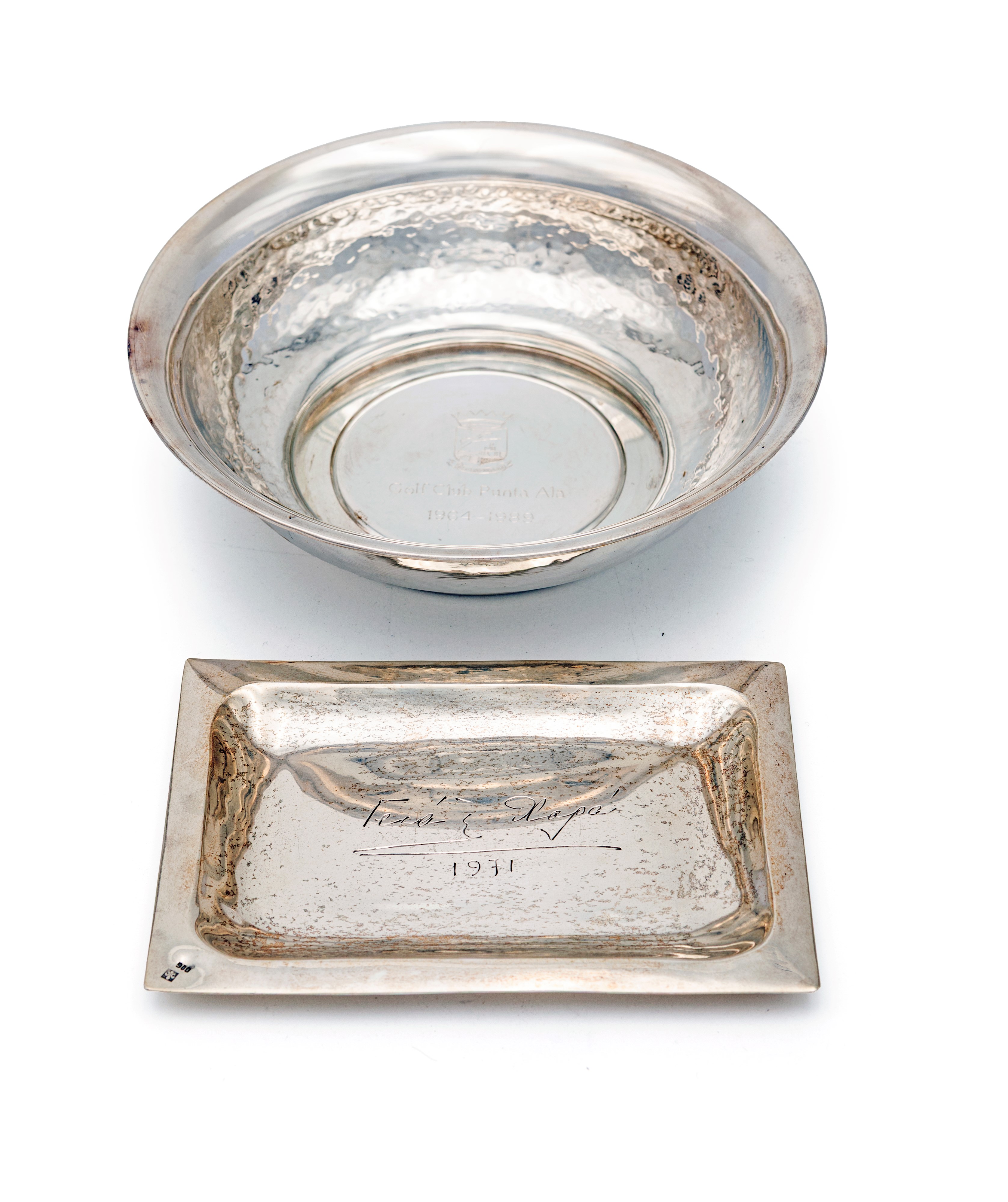 coppetta martellata con stemma centrale e iscrizione "Golf Club Punta Ala 1964 - 1989"; piattino rettangolare con firma incisa e data 1971