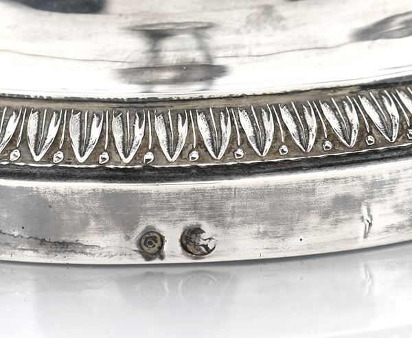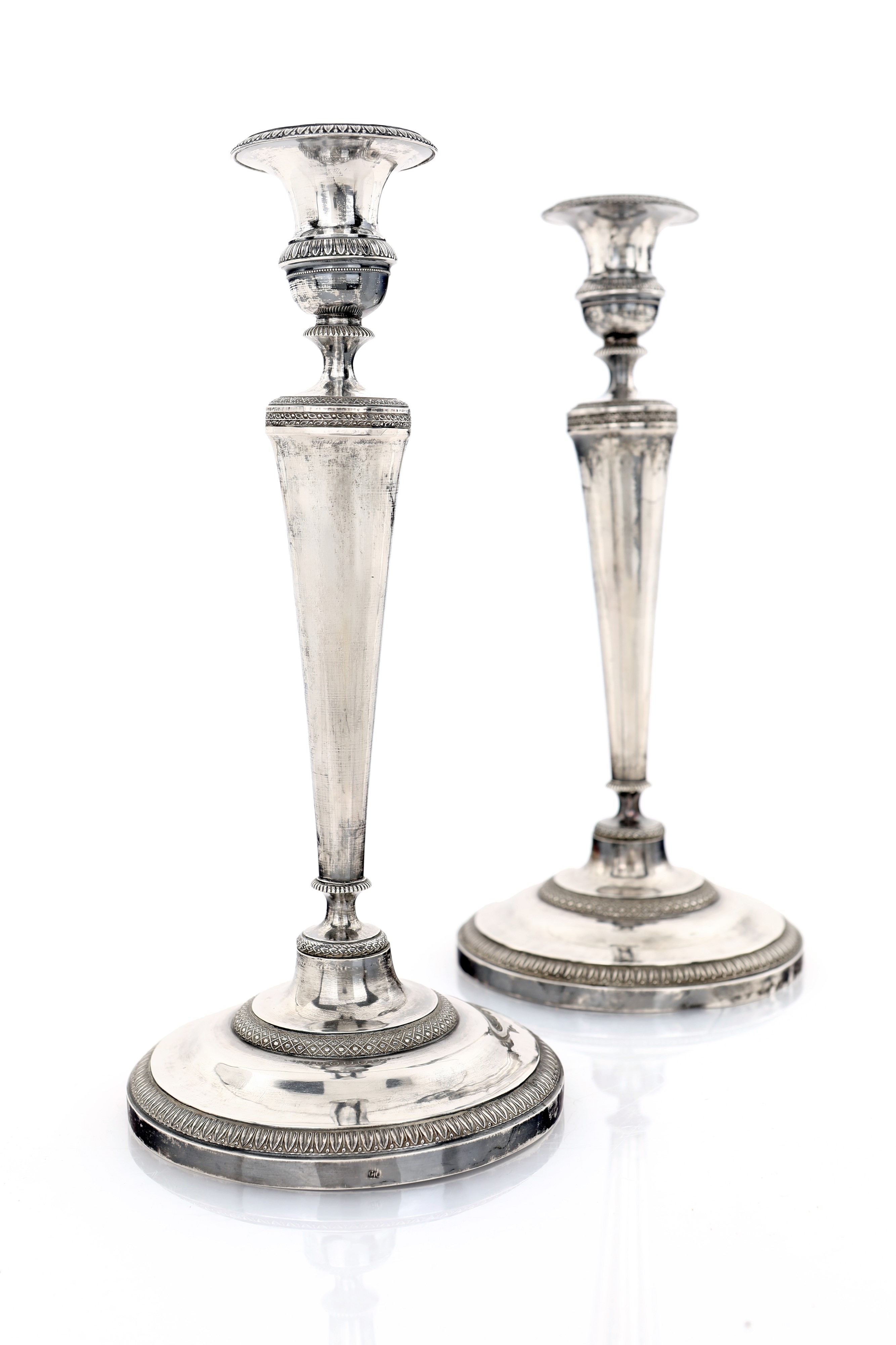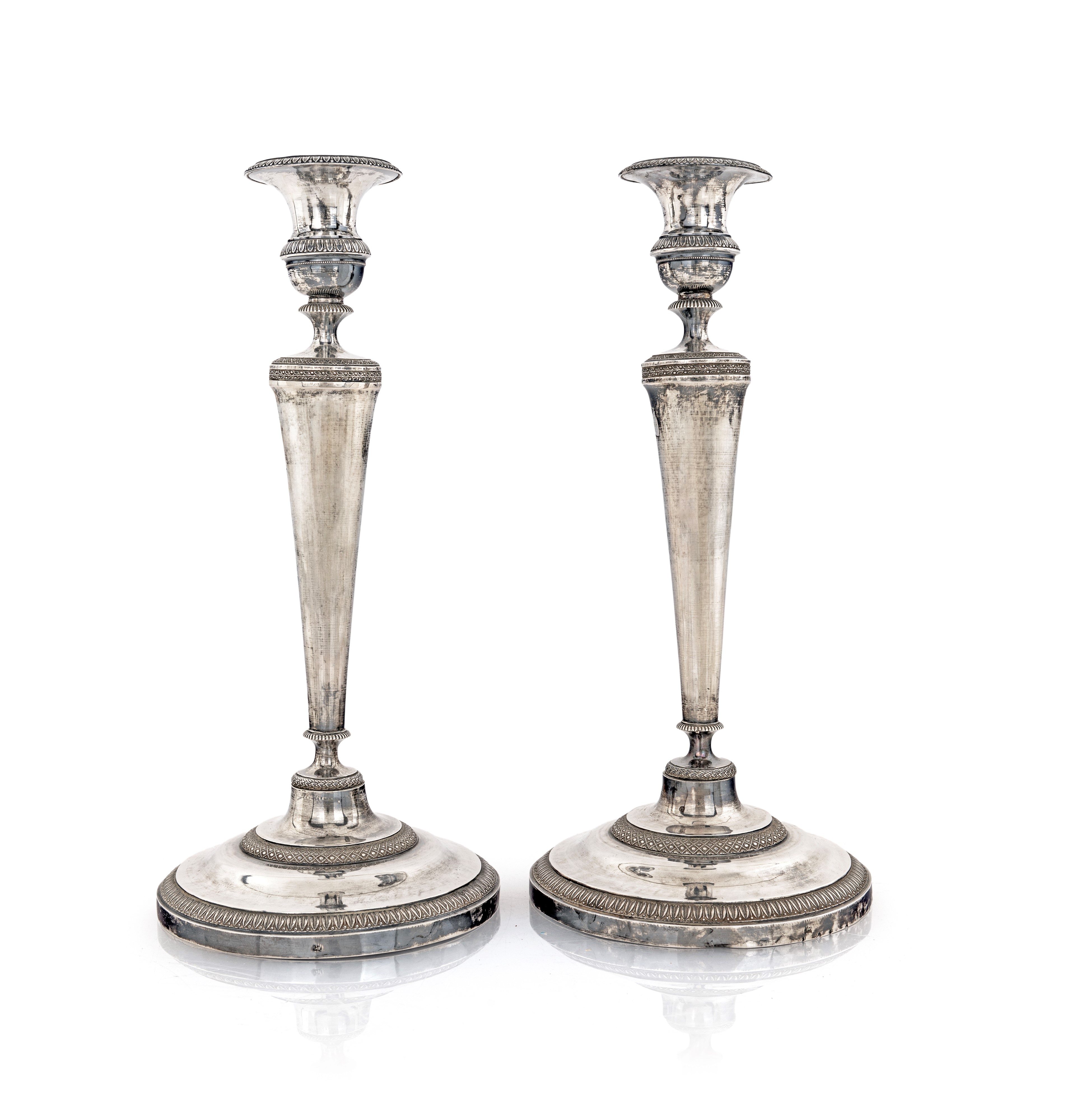 portacandela a vaso su stelo rastremato; base circolare gradinata con profilo a palmette