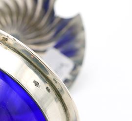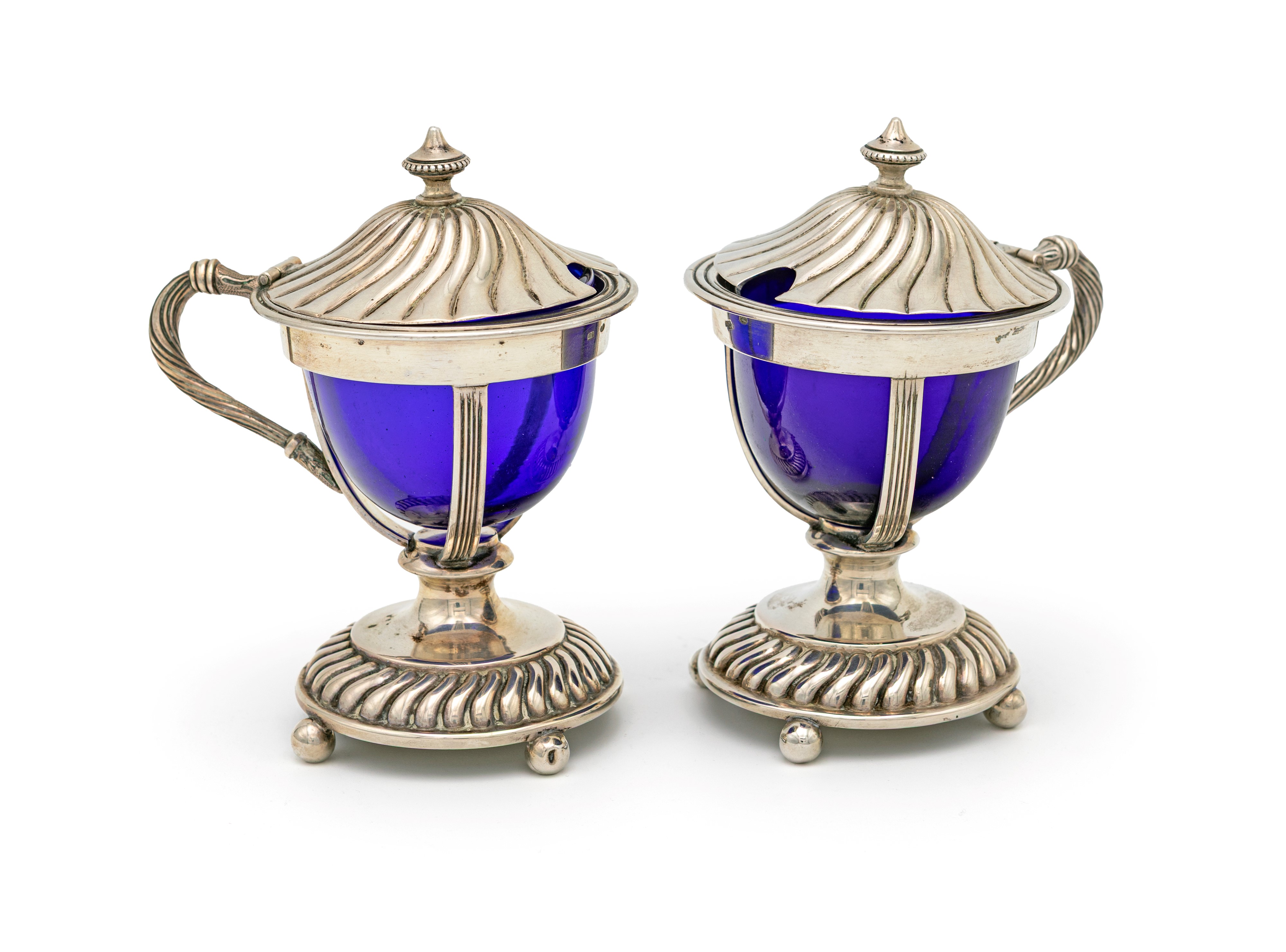 corpo a coppa con manico e coperchio incernierato; piede circolare con orlo baccellato su piedi a sfera