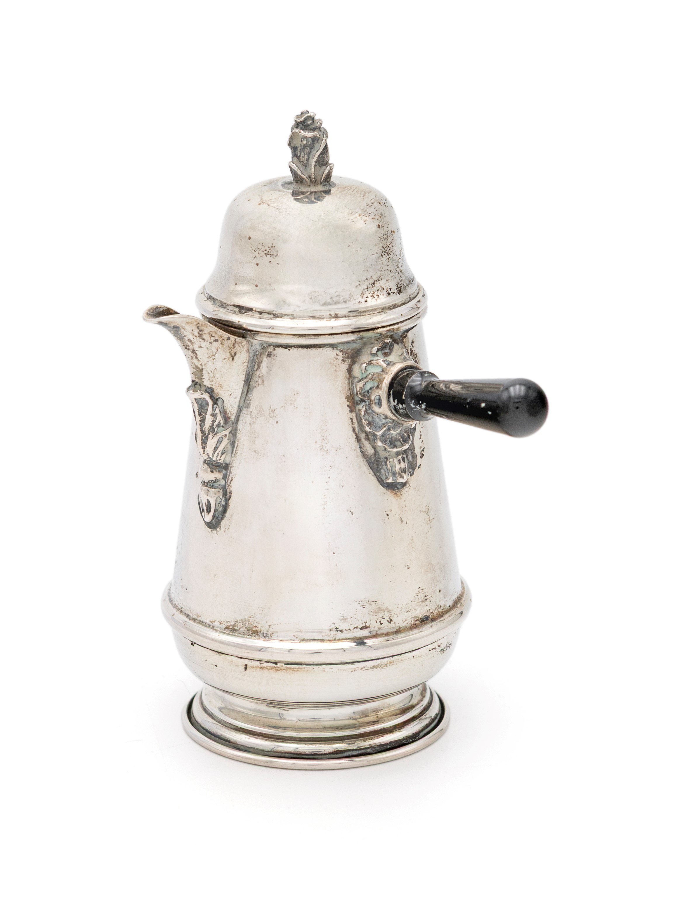 corpo a tronco di cono su piede circolare gradinato, versatoio a mensola, coperchio a cupolino sormontato da un bocciolo; manico traverso in legno ebanizzato
