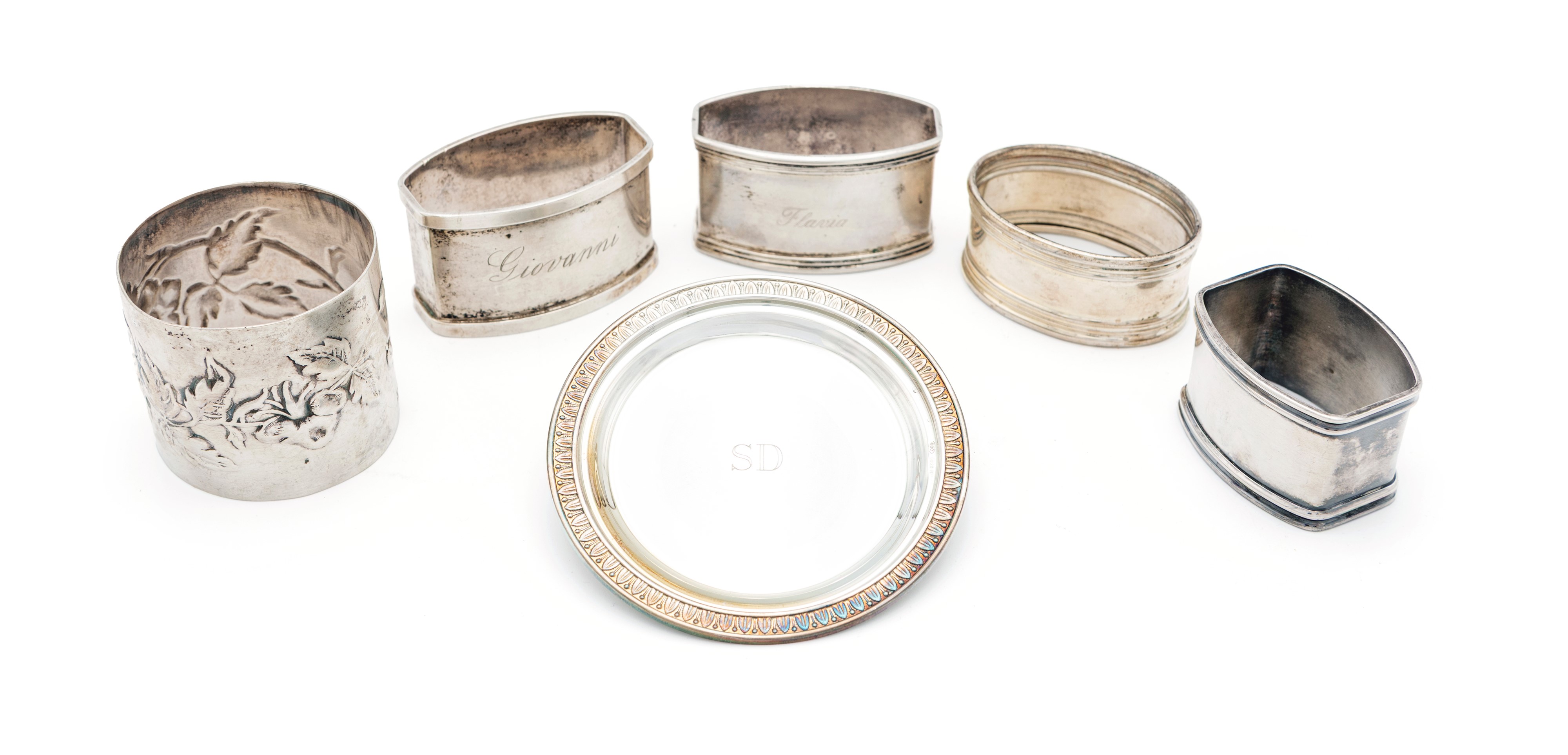 Lotto composto da cinque portatovagliolo ed un piattino con iniziali incise