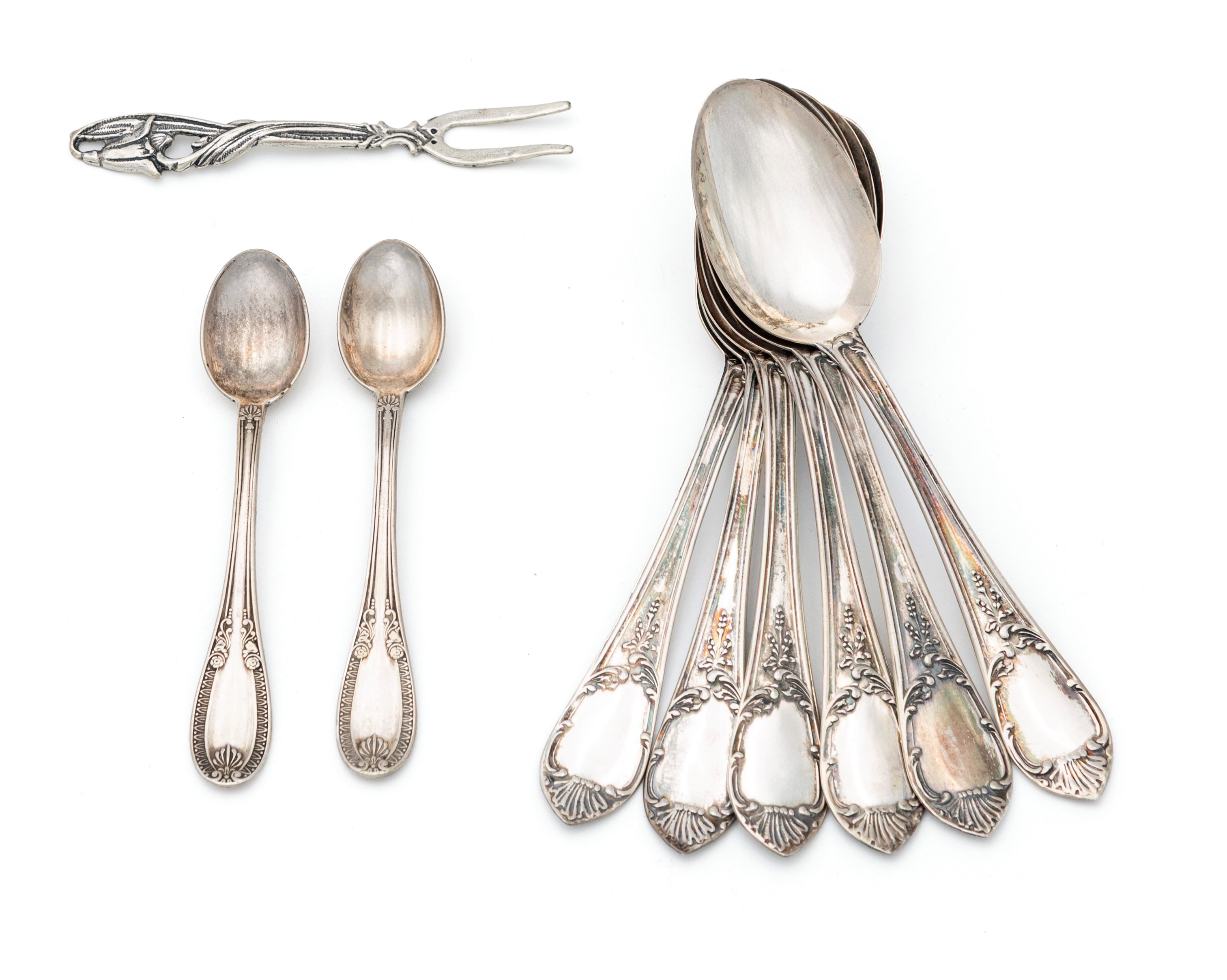 sei cucchiaini da caffè con impugnatura cesellata, una coppia di piccoli cucchiaini da saliera stile Impero ed una forchettina a due rebbi con impugnatura a forma di stelo fiorito