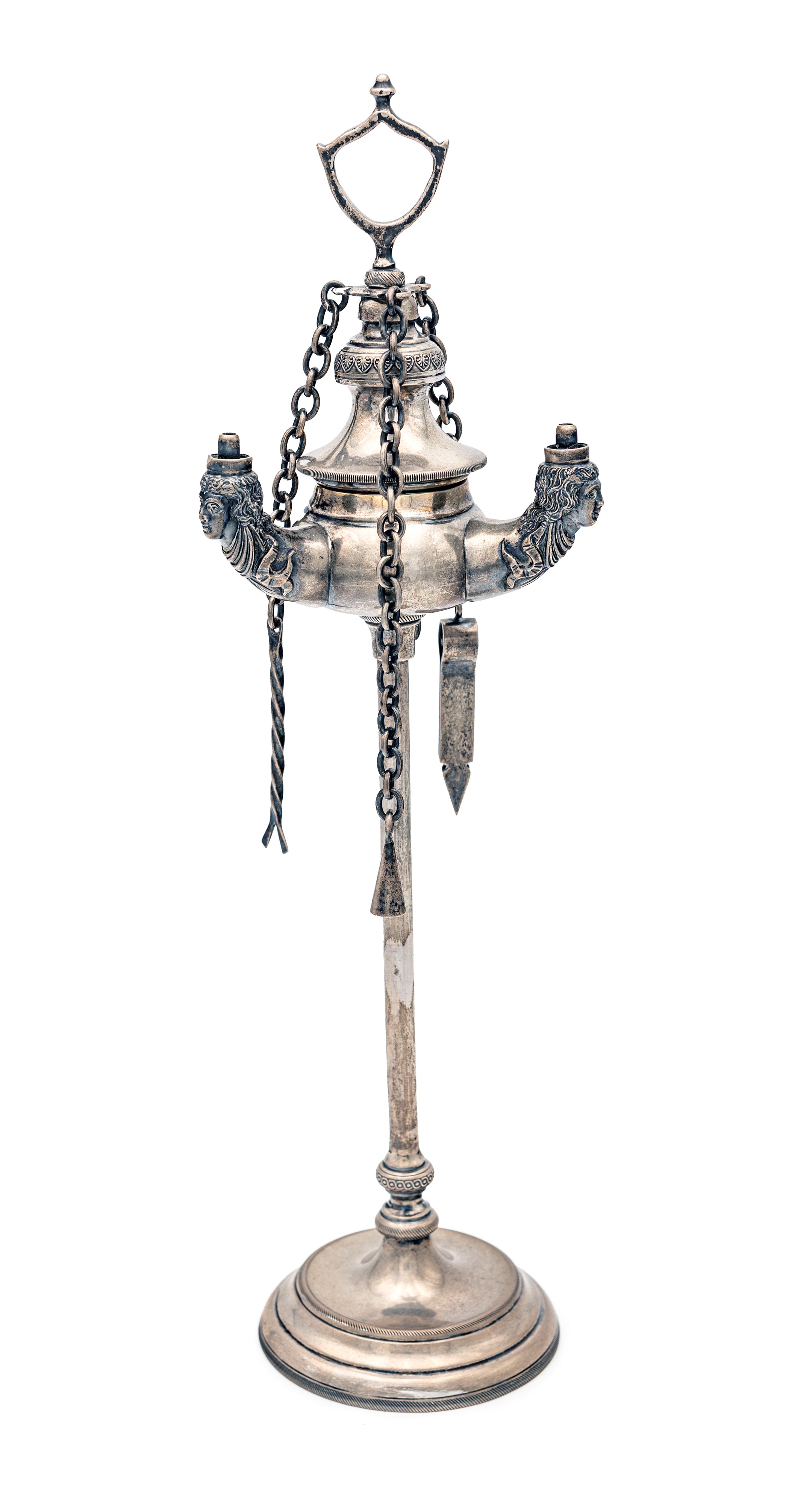 serbatoio caratterizzato da teste muliebri desunte dal repertorio classico, lungo stelo con piede circolare gradinato e presa ad anello; completa di catenelle con accessori