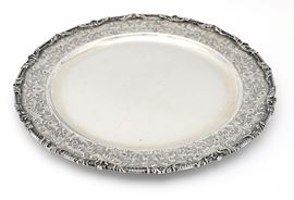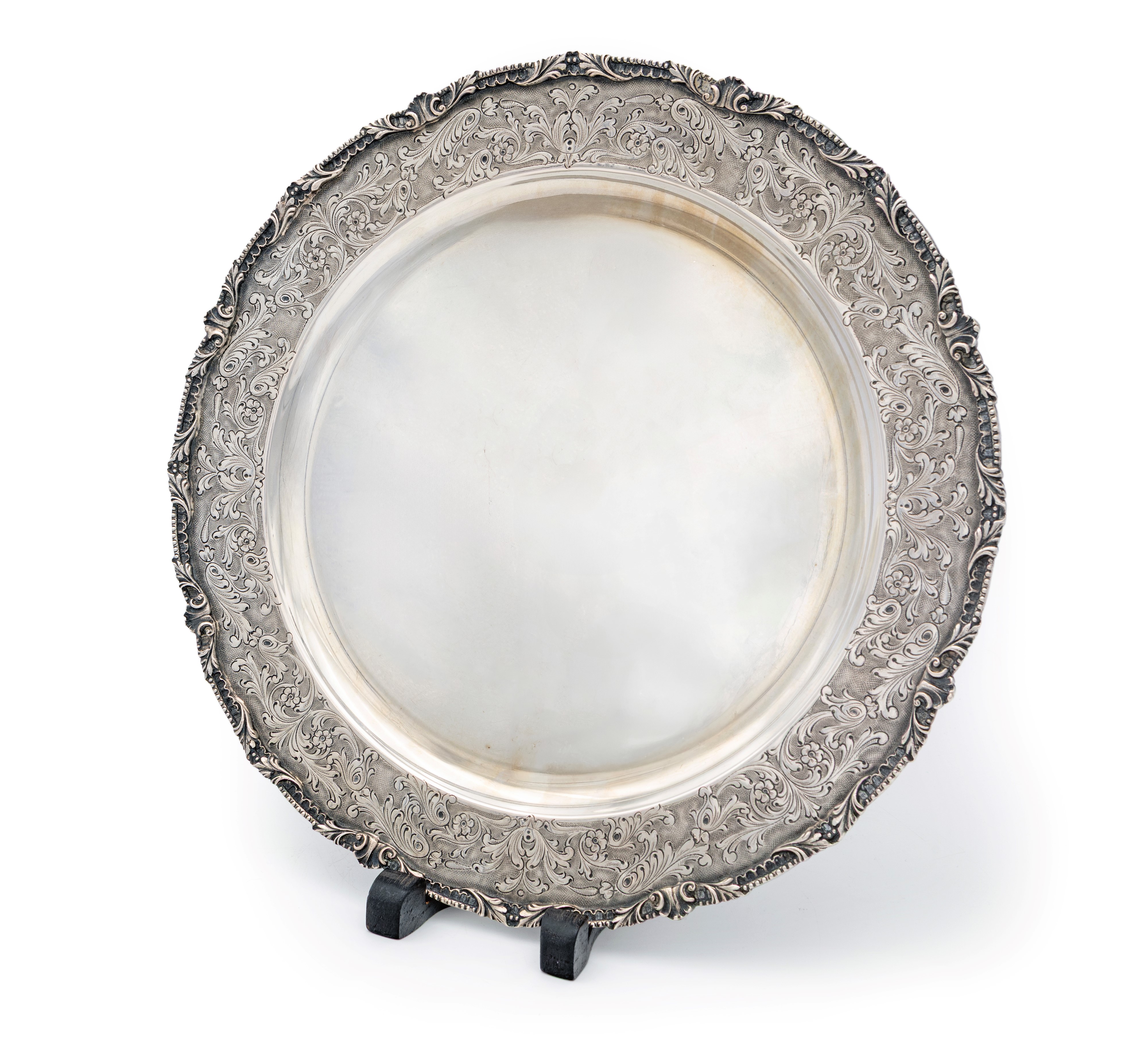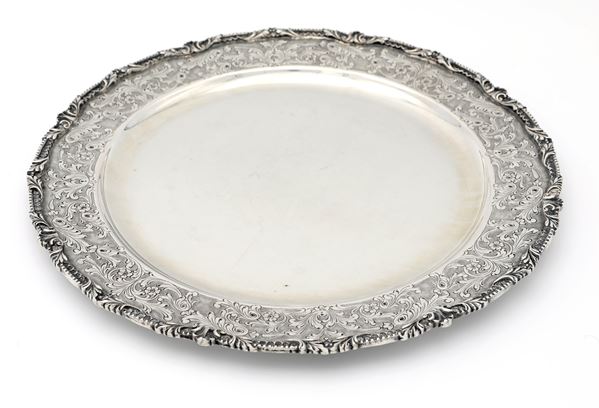 Piatto circolare con tesa incisa a volute vegetali e fiori