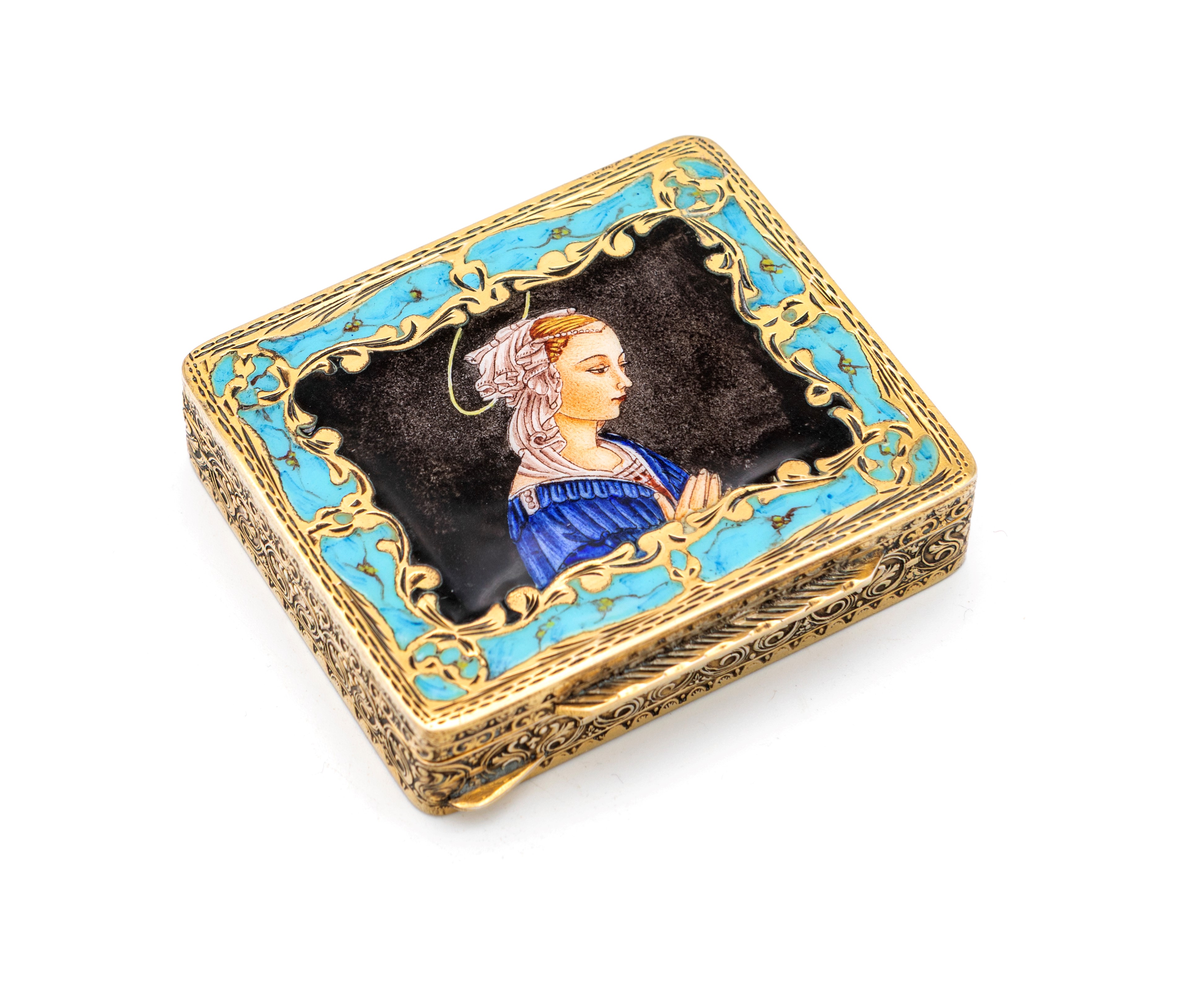Piccola scatola in argento dorato con miniatura in smalto raffigurante Vergine in preghiera