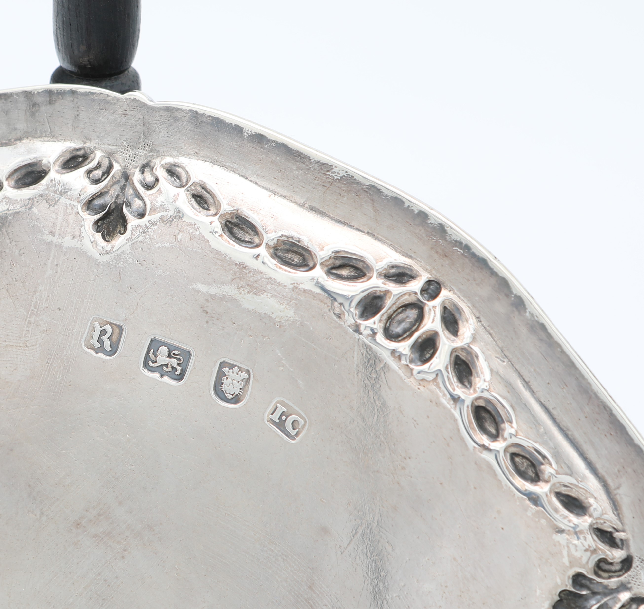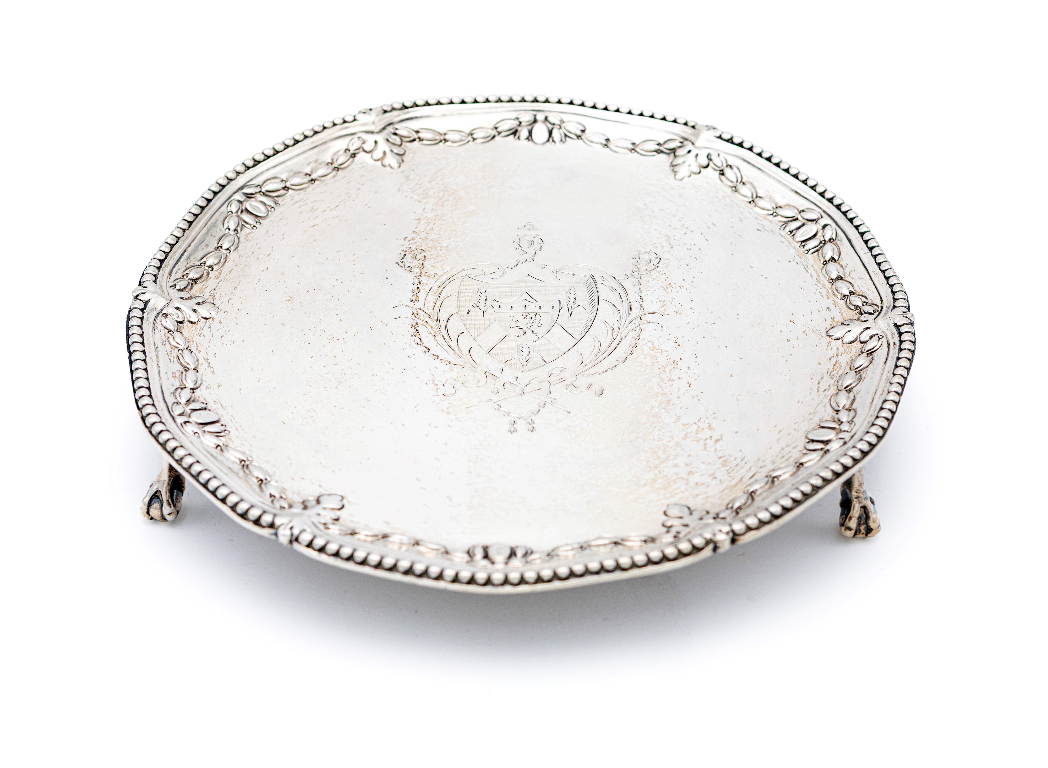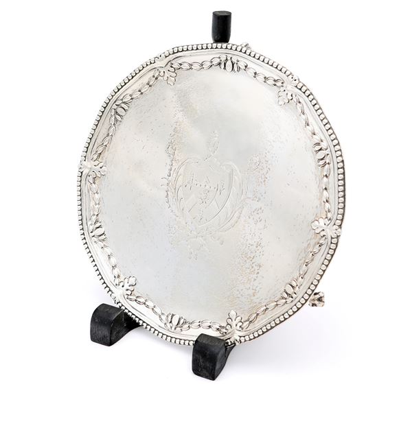 piatto circolare con profilo sagomato percorso da perline, sottolineato da una ghirlanda sbalzata; al centro stemma araldico inciso; tre piedini ad artiglio su sfera