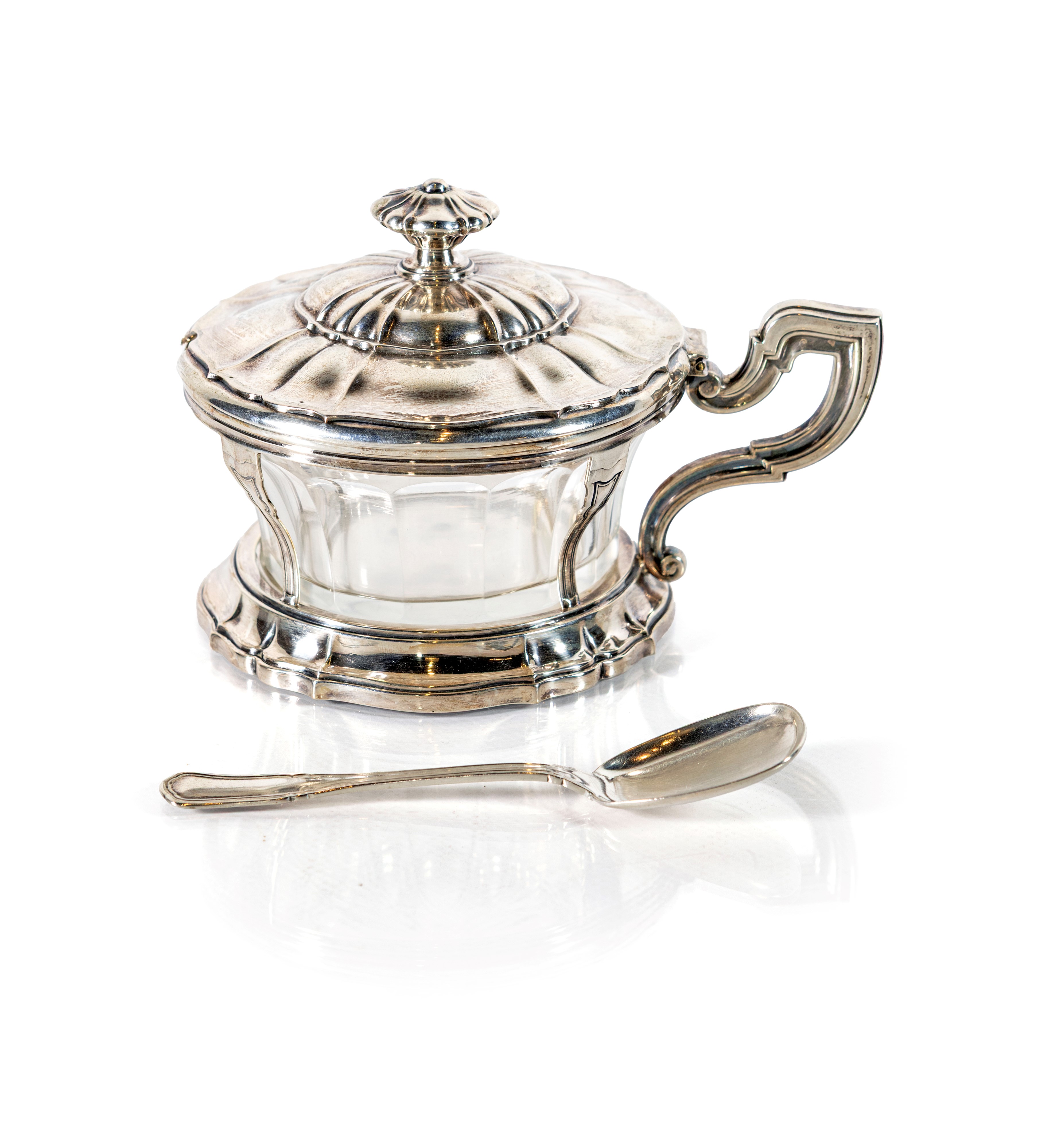 Portaformaggio circolare in argento 800/000 e vetro con cucchiaino
