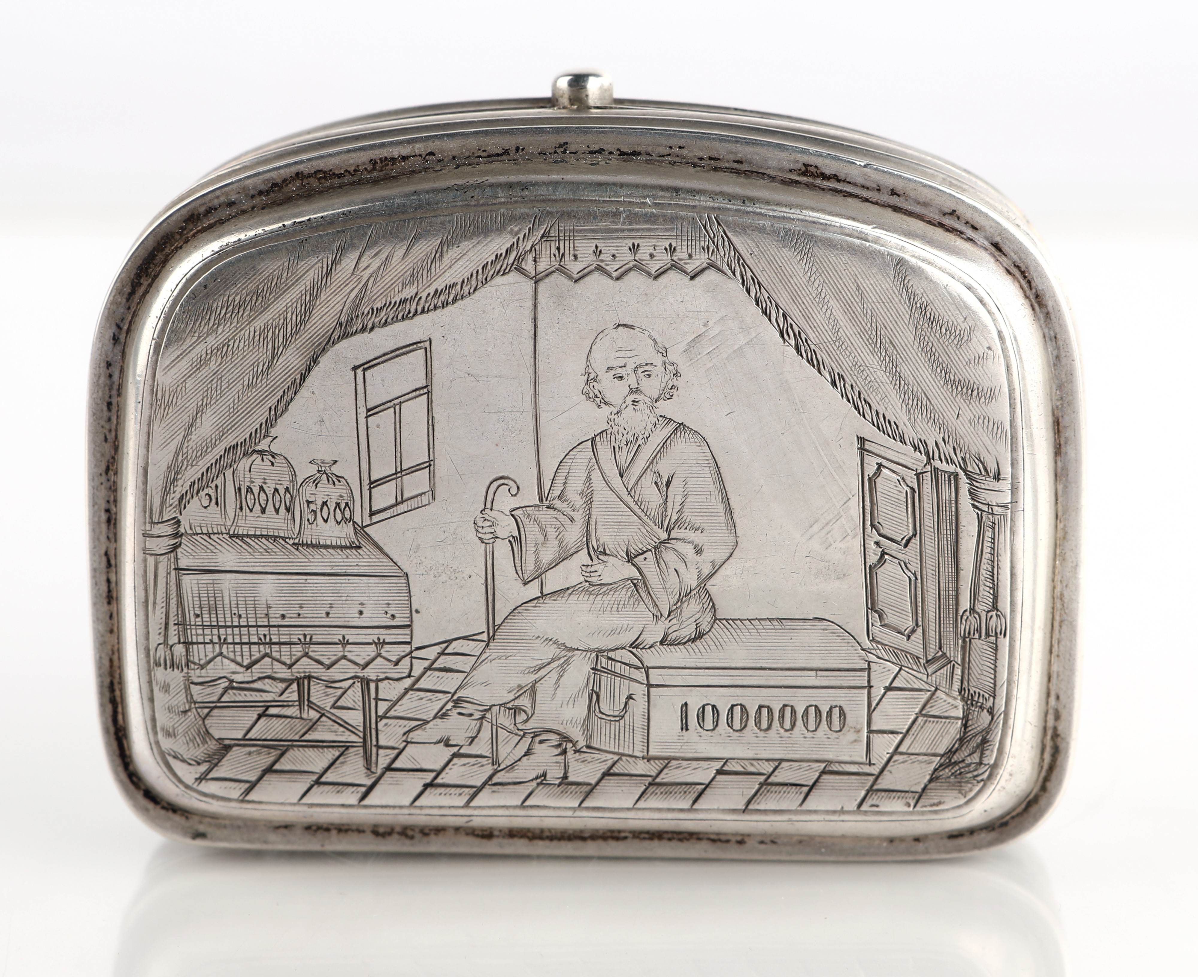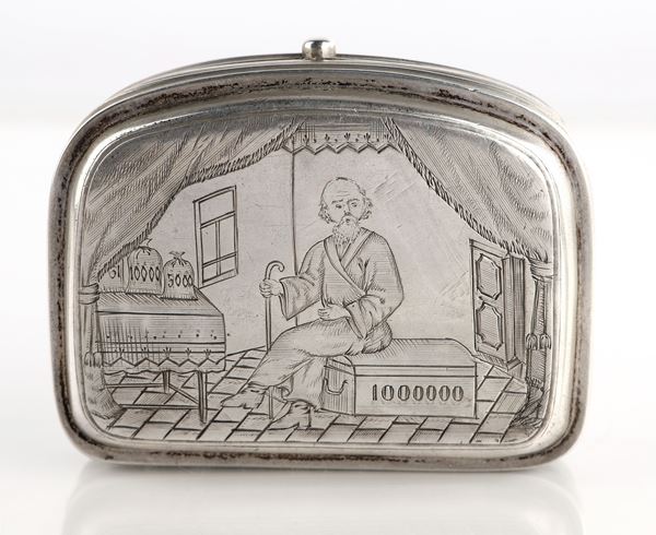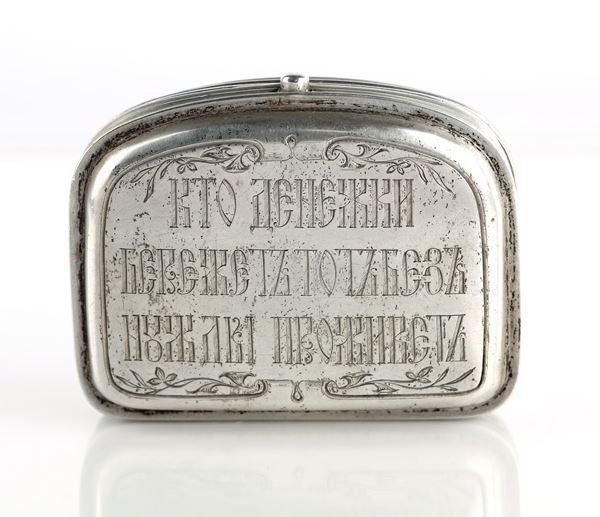 rivestita internamente in velluto rosso porpora, reca scena di genere incisa e motto in cirillico sul lato opposto