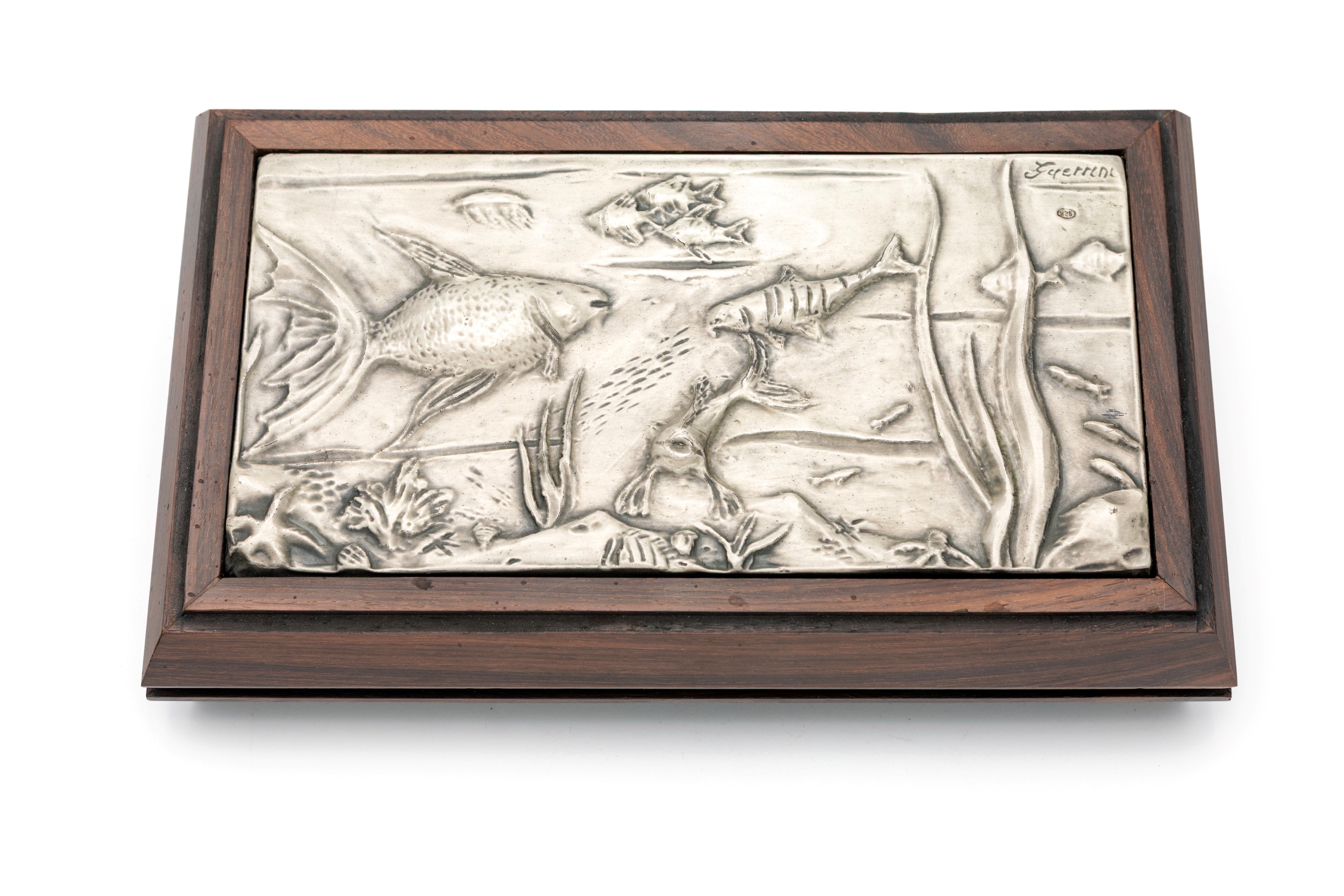 Scatola rettangolare in legno con bassorilievo in argento 925/000 firmato Guerrini