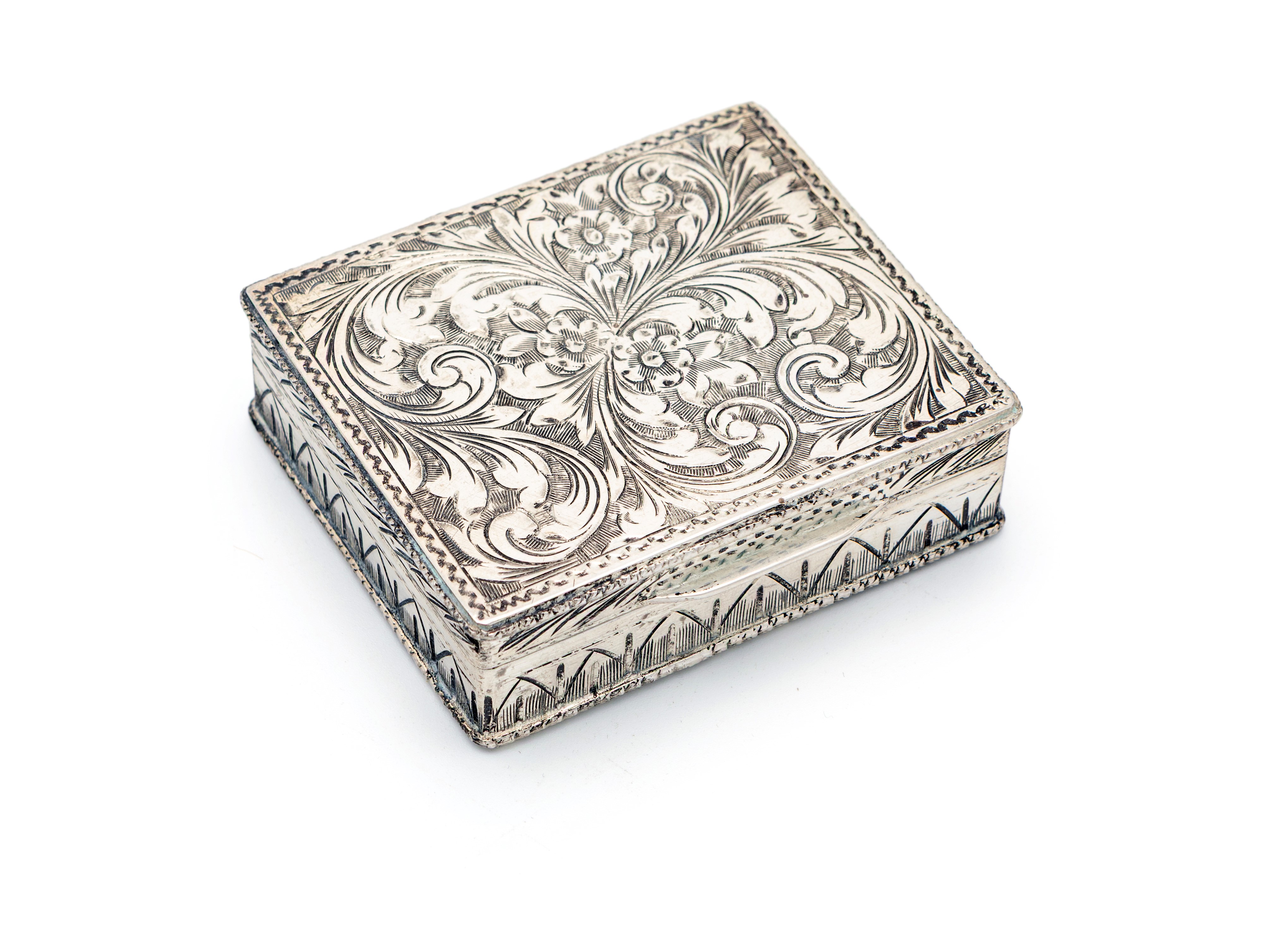 Scatolina rettangolare in argento con volute vegetali incise