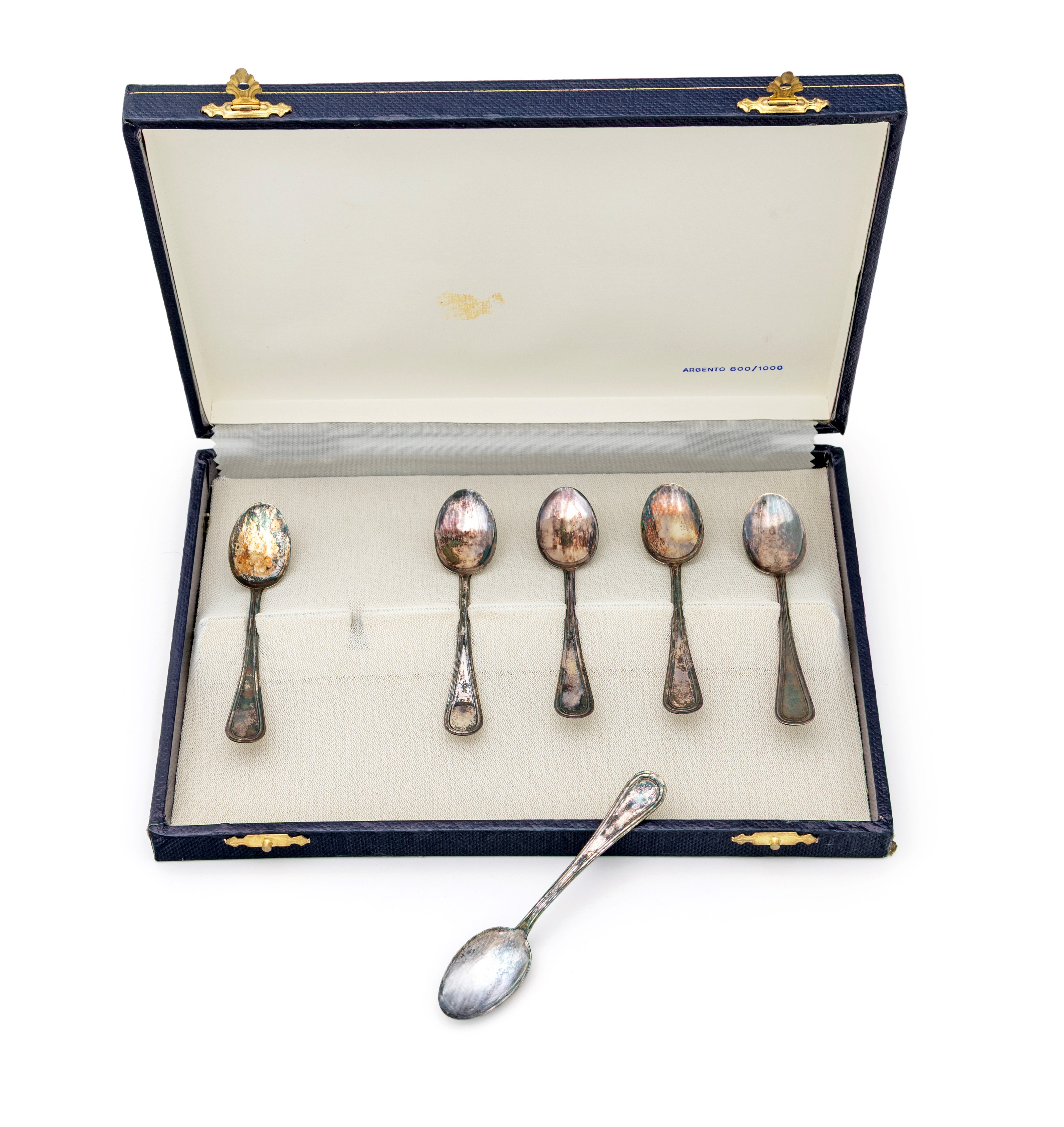 Sei cucchiaini da caffè in argento 800/000 stile inglese, entro scatola