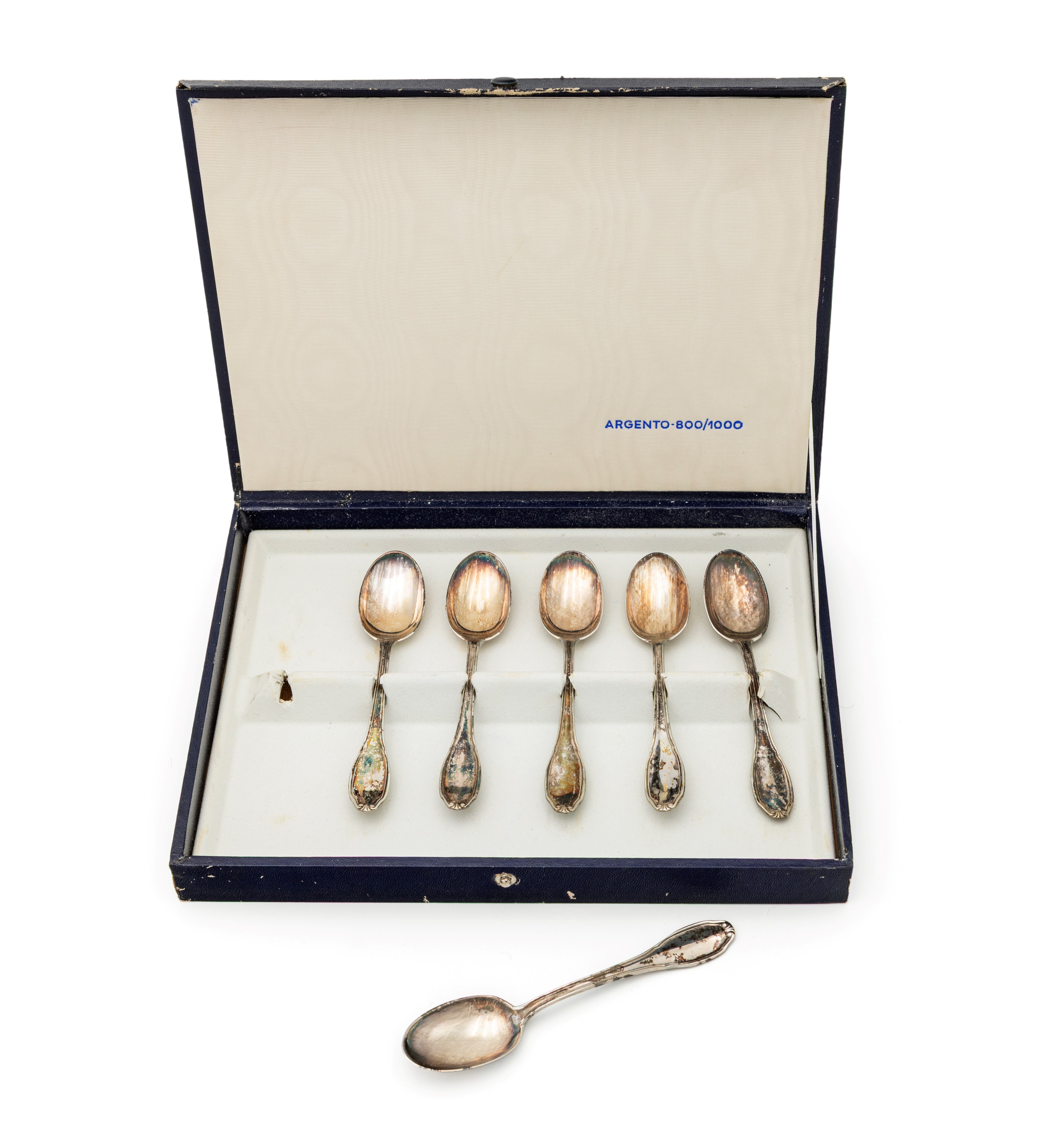 Sei cucchiaini da tè in argento 800/000, entro scatola