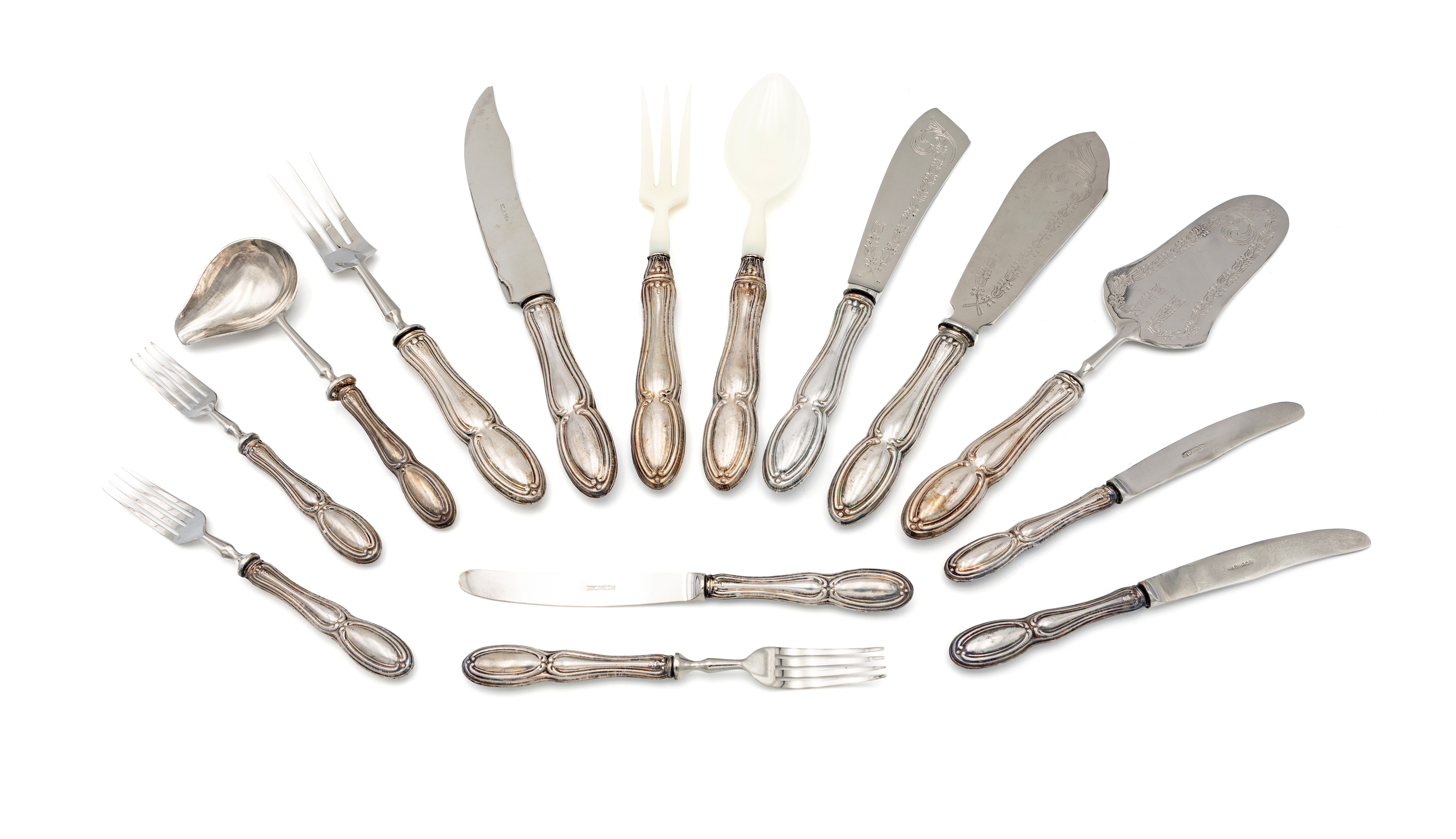 dodici forchette (cm 16,4) ed altrettanti coltelli (cm 19); due coltelli diversi con lame incise (cm 25,5 e cm 28), paletta (cm 28); forchetta e coltello da arrosto (cm 24 e cm 27,5); mestolo da salsa (cm 18,5) e due posate da insalata (cm 24,5)