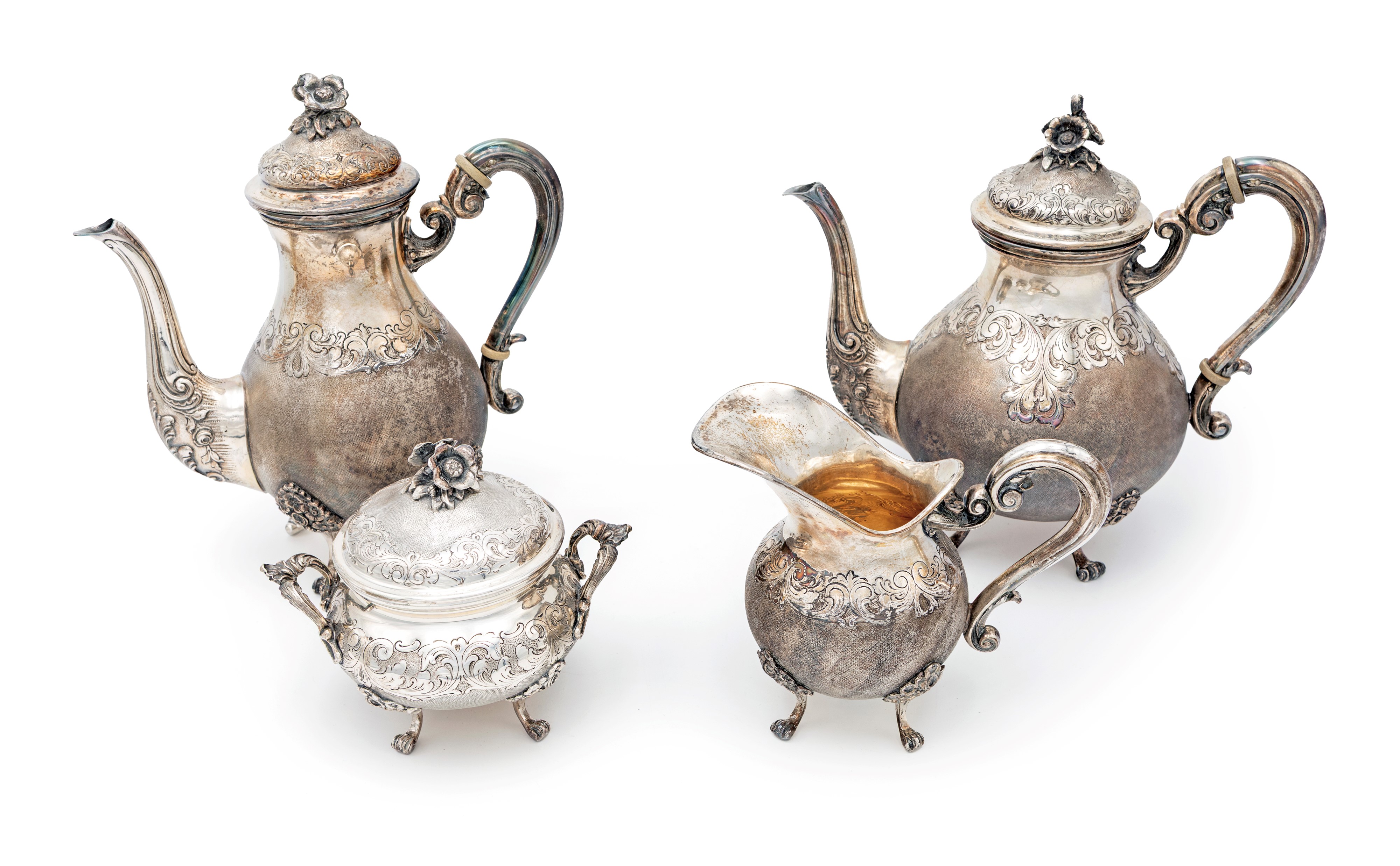 Servizio da tè e caffè composto da quattro elementi in argento 800/000, Fornari, Roma