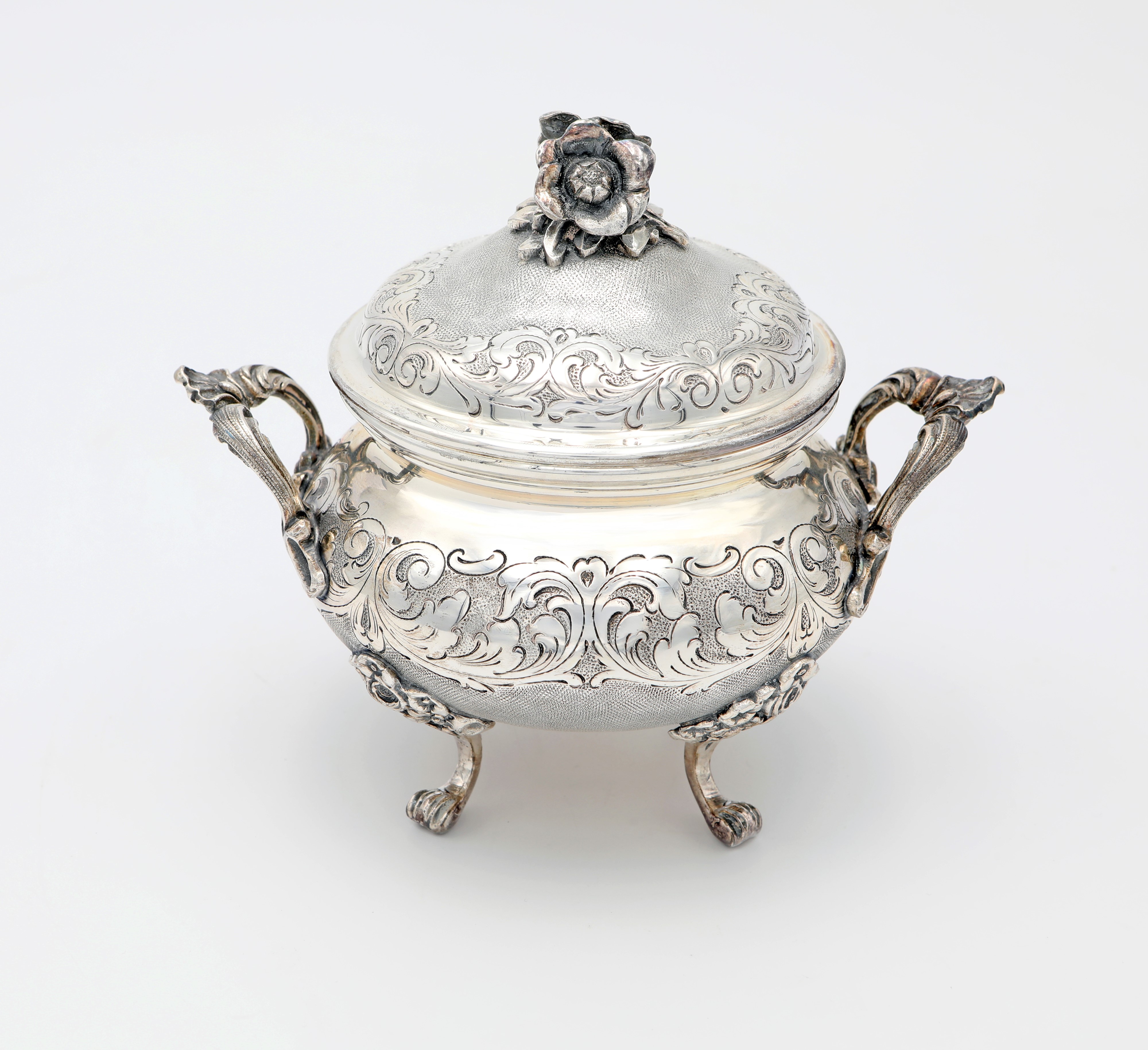 teiera e caffettiera dalle analoghe caratteristiche, si differenziano unicamente nell'apertura del coperchio (altezza cm 21 e cm 23); lattiera ad anfora con versatoio svasato (cm altezza cm 12,5); zuccheriera biansata con coperchio (cm 12x14,5x9)
