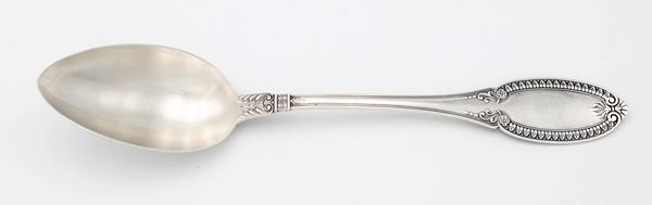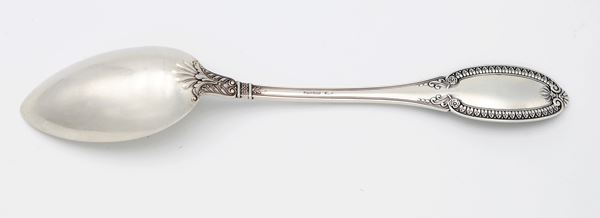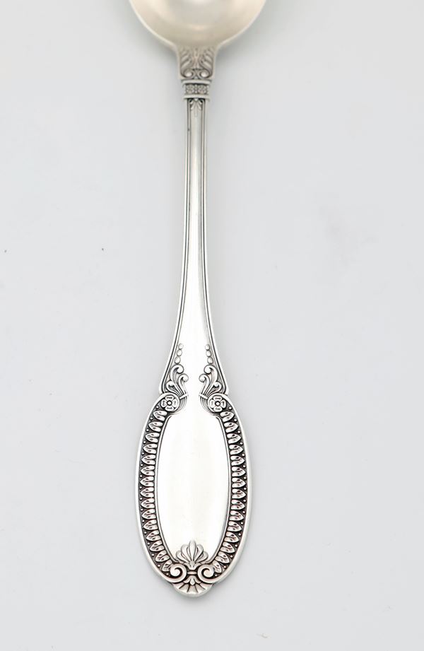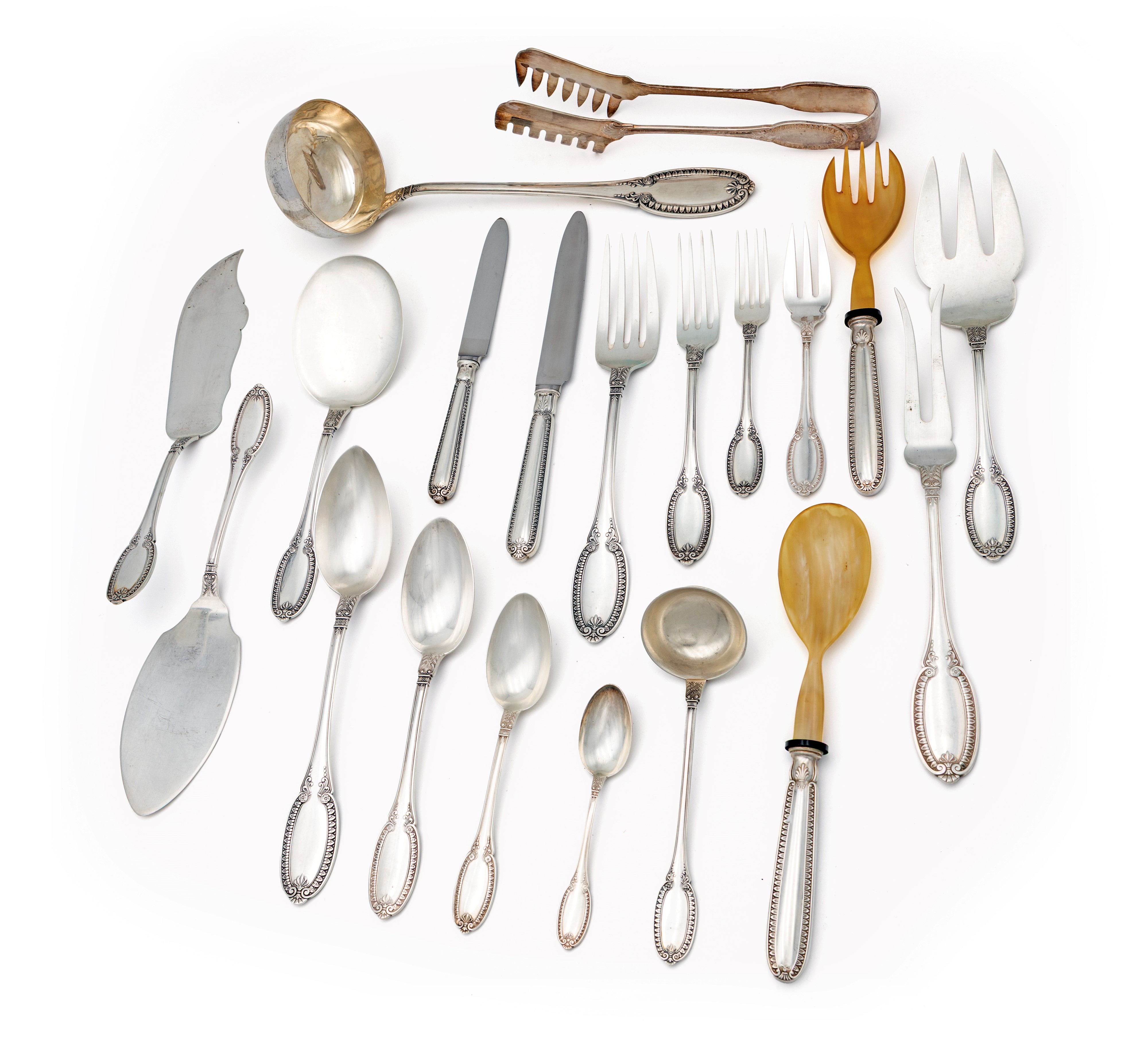 18 cucchiai da minestra (cm 21,5 - gr. 1.524); 36 forchette (cm 21 - gr. 2.980) e 18 coltelli da pasto (cm 24,5); 18 forchette da pesce (cm 17,5 - gr. 1.038) ed altrettanti coltelli (cm 21,7 - gr. 1.148); 18 forchette da frutta (cm 17,3 - gr. 892) ed altrettanti coltelli (cm 21,5); 18 forchettine da dolce (cm 14,7 - gr. 590); 18 cucchiai da dolce (cm 17,5 - gr. 894); 18 cucchiaini da tè (di cui 12 da cm 13 - gr. 266 e 6 da cm 14,3 - gr. 182); 18 cucchiaini da caffè (cm 10,7 - gr. 280); 12 coltellini da burro (cm 12,2 - gr. 218); pinza per servire (cm 24 - gr. 200); due posate da insalata in argento e corno (cm 24); quattro cucchiai da portata (cm 26 - gr. 534); due forchette da portata a quattro rebbi (cm 36 - gr. 270) e due a tre rebbi (cm 24,3 - cm 244); due forchettoni da arrosto (cm 27 - gr. 244); due palette con lama a sciabola (cm 29,5 - gr. 312); una paletta tonda (cm 23,8 - gr. 124) ed una da dolce (cm 27 - gr. 152); due mestolini ed una forchetta da antipasto (cm 18 e cm 21 - peso complessivo gr. 174); un mestolo (cm 32 - gr. 302)