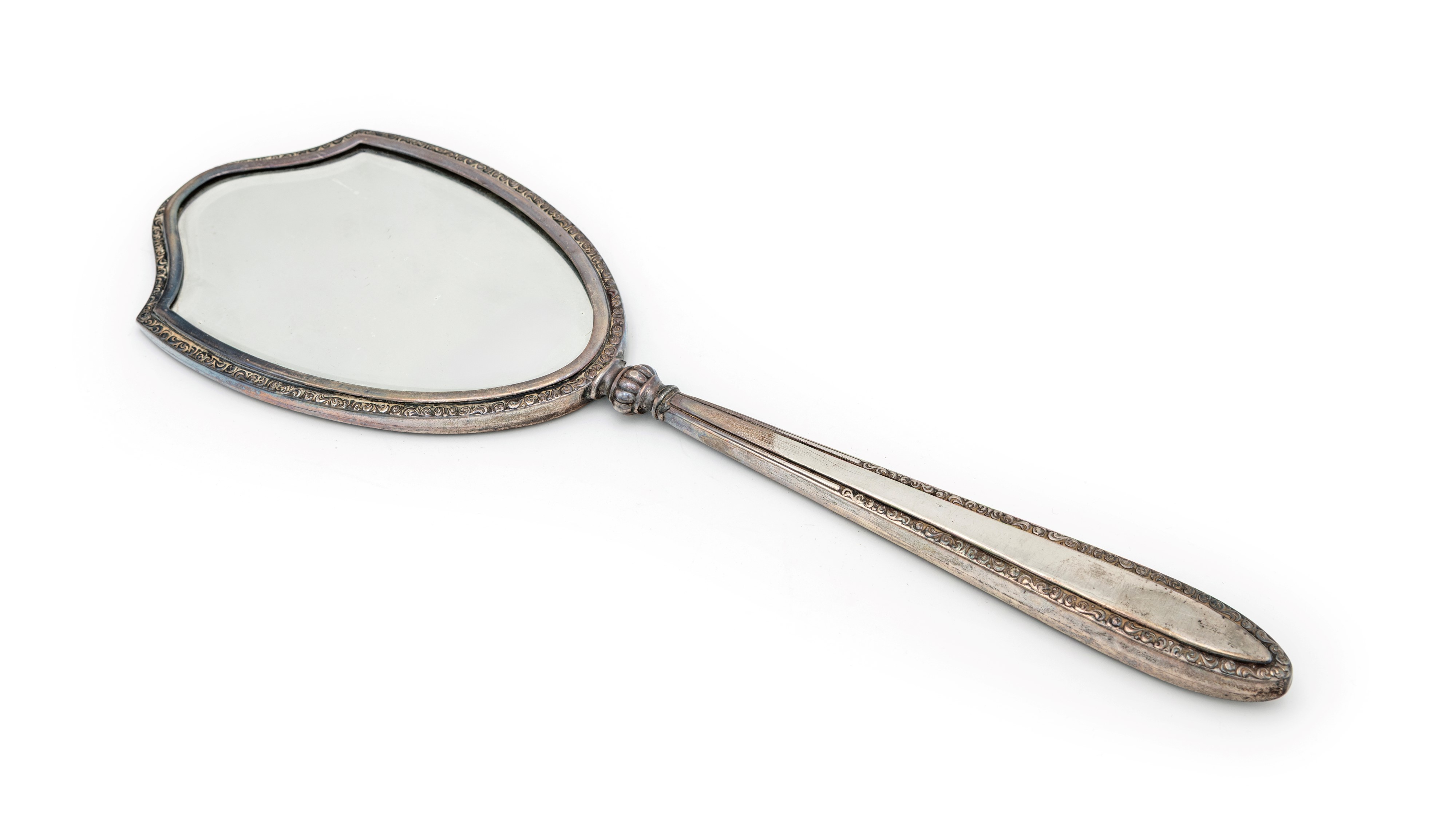a forma di scudo con lungo manico e profili percorsi da volute sbalzate