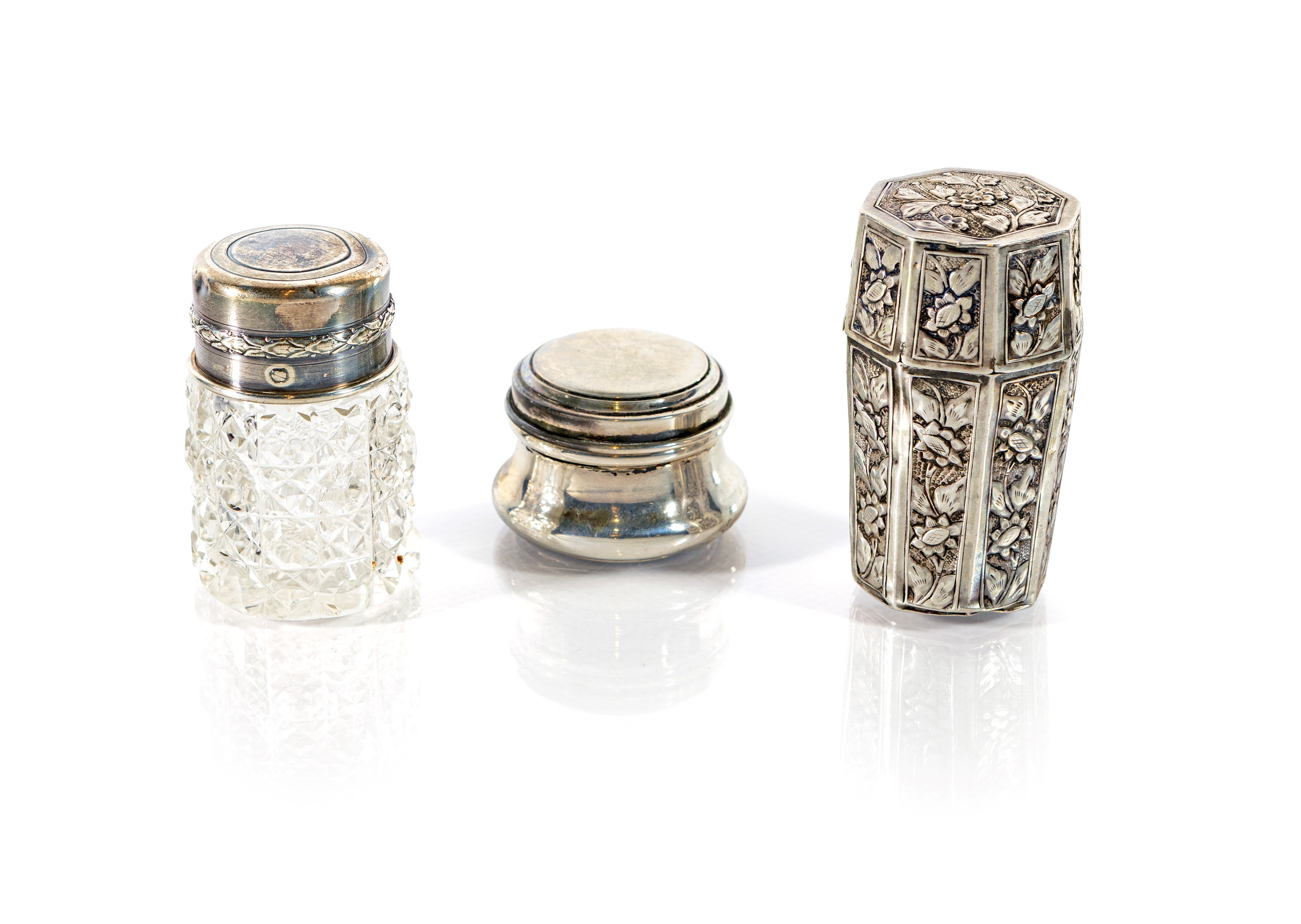portapillole circolare (cm 3x4 - gr. 25); flacone in cristallo con tappo in argento (cm 6x3,5 - gr. 8); scatola ottagonale in lamina sbalzata ed incisa a motivi floreali (cm 6,5x3x3 - gr. 34)