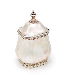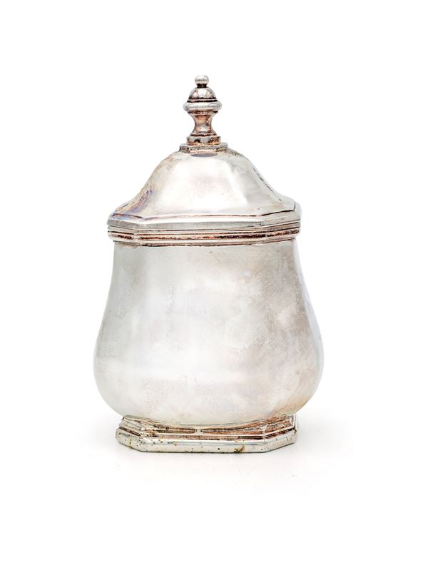 corpo poliedrico su basso piede modanato; coperchio sormontato da un pinnacolo