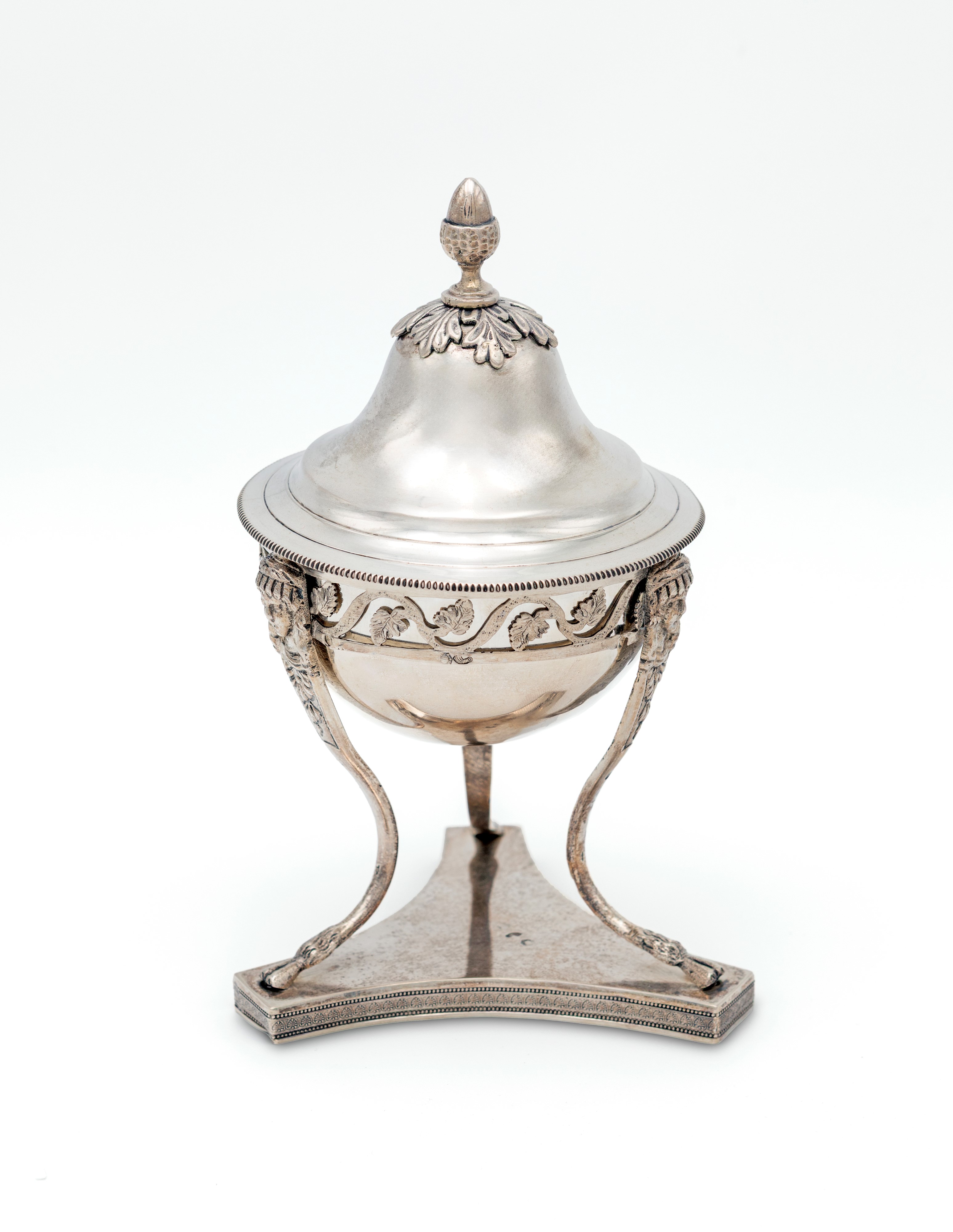 corpo semisferico con alloggio costituito da una fascia traforata decorata da una linea ondulata con foglie incise, sorretta da tre figure di cariatide terminanti a zoccolo; coperchio a cupolino dominato da una ghianda; base trilobata. Difetti e restauri