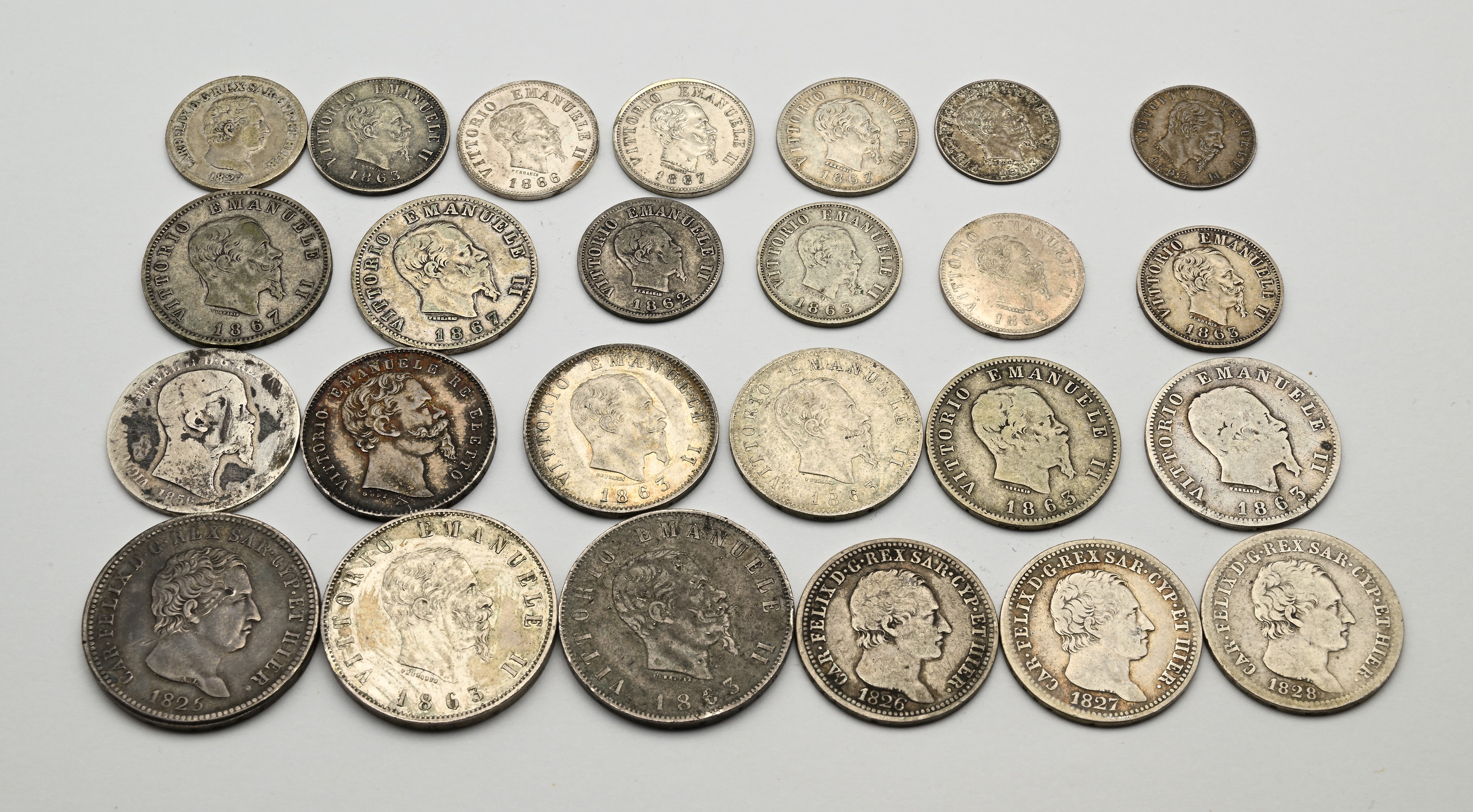 2 Lire 1825T, 1 Lira 1826T, 1827T, 1828T(P), 50 Cts 1827G Carlo Felice, 1 Lira 1856 Vittorio Emanuele II; 1 Lira 2° tipo 1860 Firenze Vittorio Emanuele II Re Eletto; 2 Lire Stemma 1863N, 1863T, 1 Lira Stemma 1863M, 1863T, 1867M, 1867T, 1 Lira Valore 1863M (2), 50 Cts Stemma 1862N, 1863M, Valore 1863T, M e N, 1866M, 1867M e N, 20 Cts Valore 1863T e M Vittorio Emanuele II