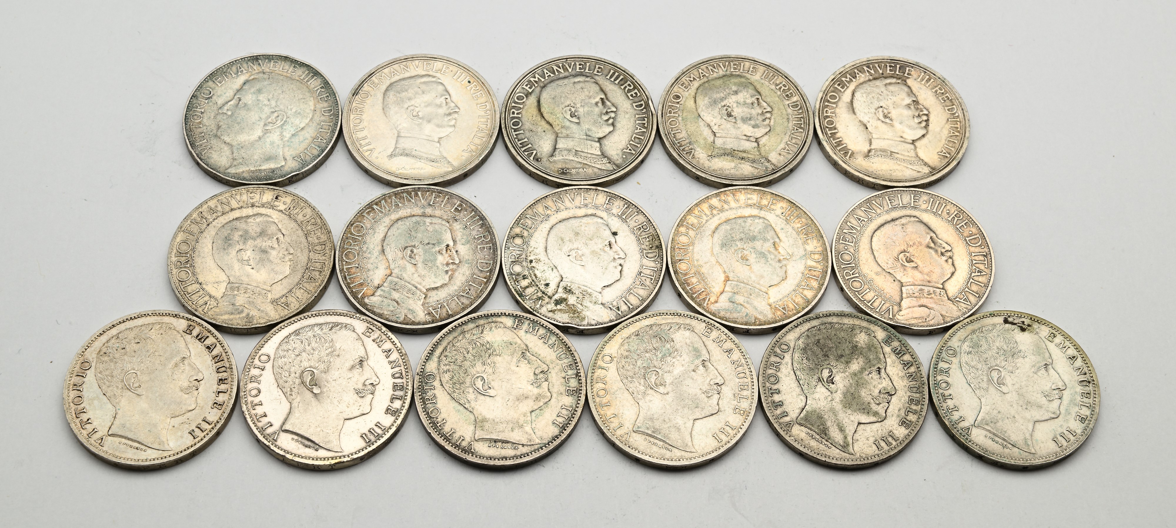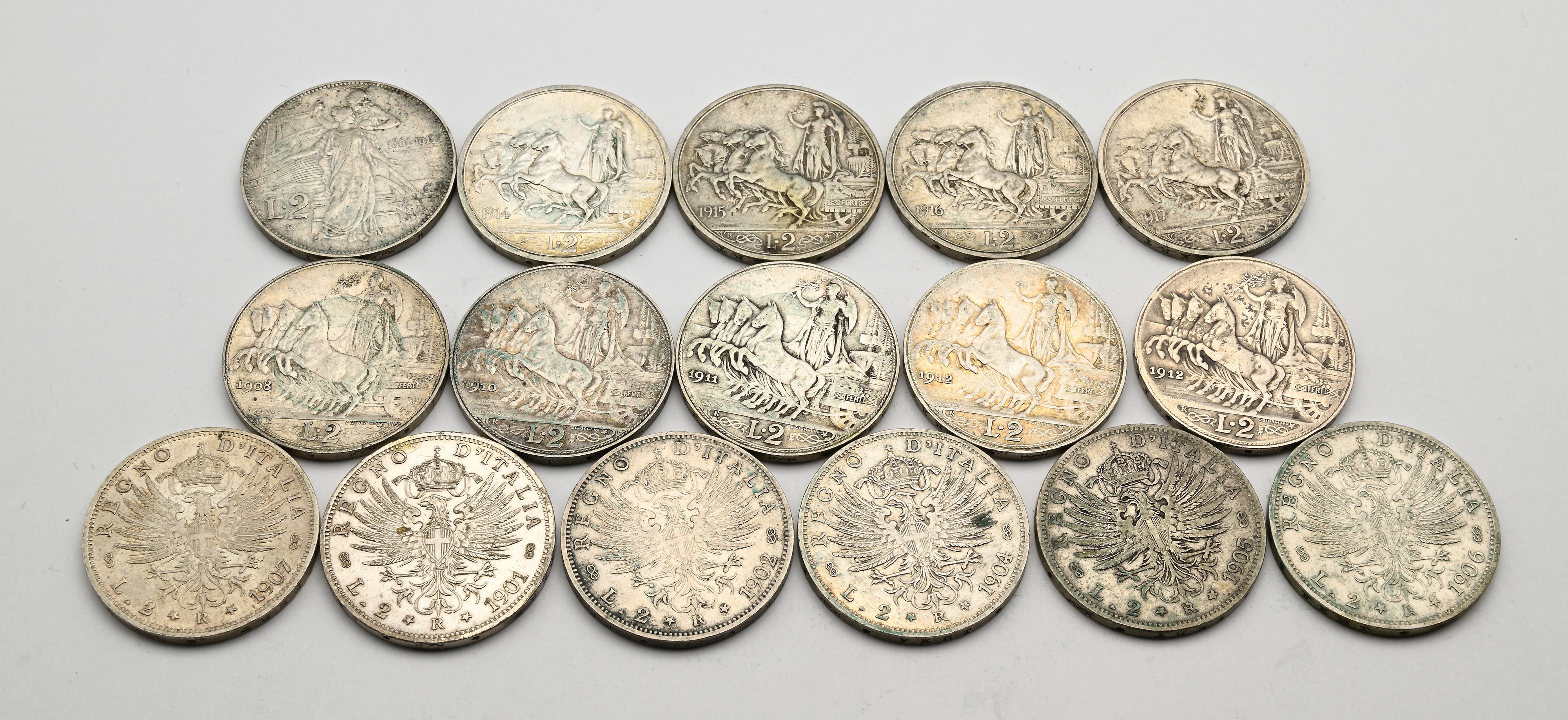 2 Lire Aquila 1901, 1902, 1904, 1905, 1906, 1907, Quadriga veloce 1908, 1910, 1911, 1912 (2), Cinquantenario 1911, Quadriga briosa 1914, 1915, 1916, 1917 Vittorio Emanuele III Regno d'Italia
