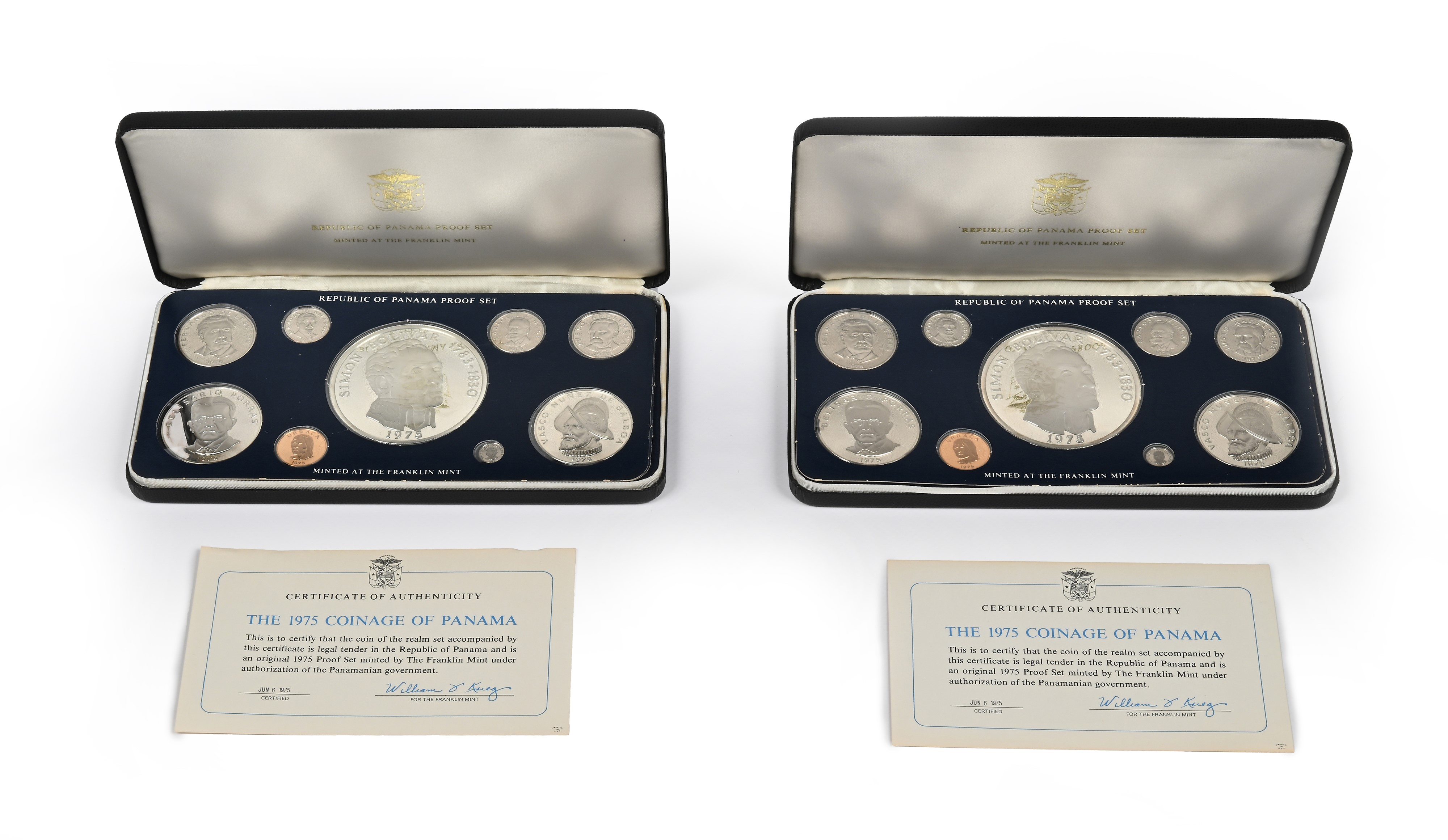 2 Serie divisionali complete di 9 monete proof: 20, 5, 1 Balboas, 50, 20, 10, 5, 2,5 e 1 Cts 1975 Repubblica di Panama