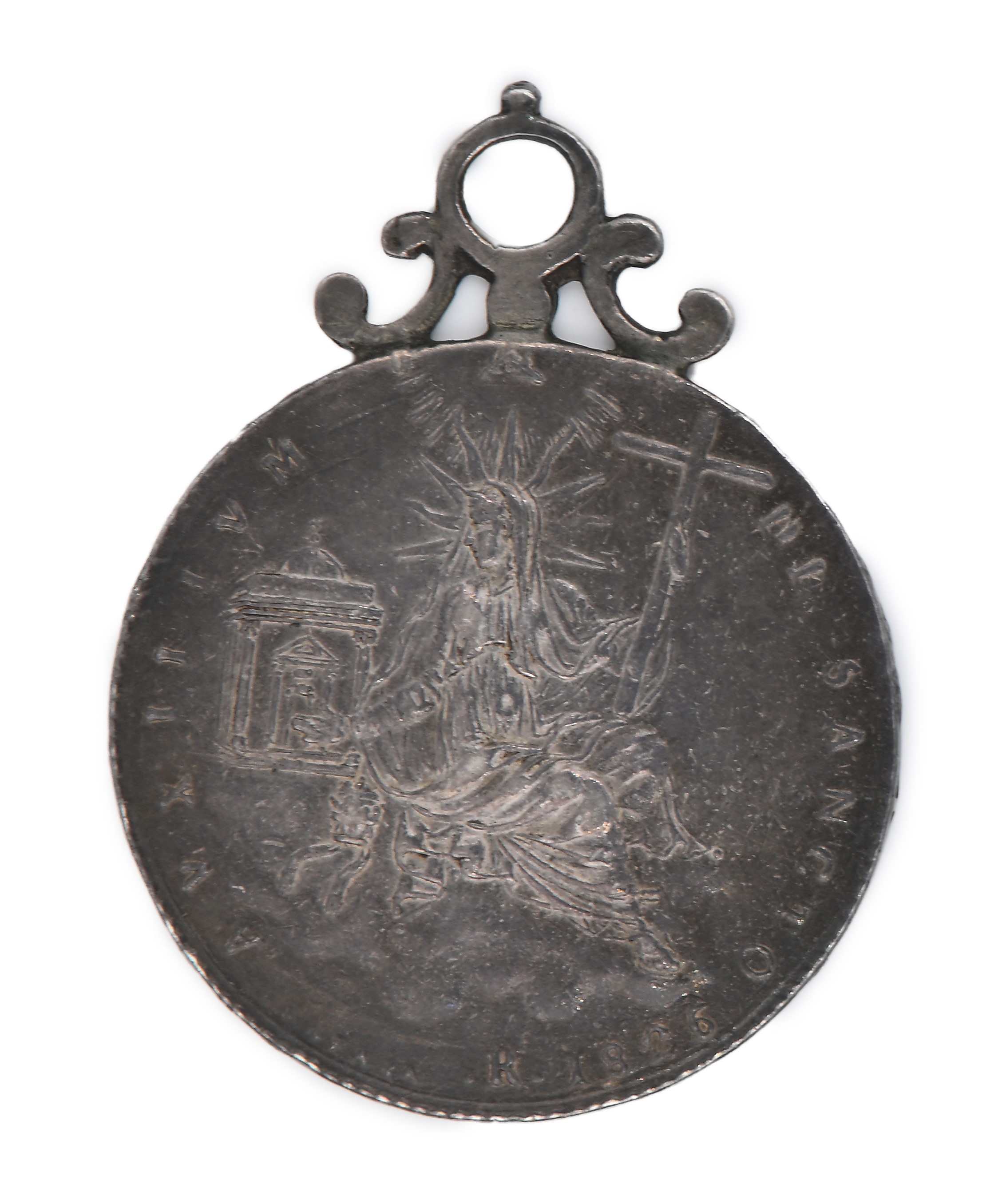 R/ AVXILIVM DE SANCTO La Chiesa seduta sulle nubi con tempio e croce