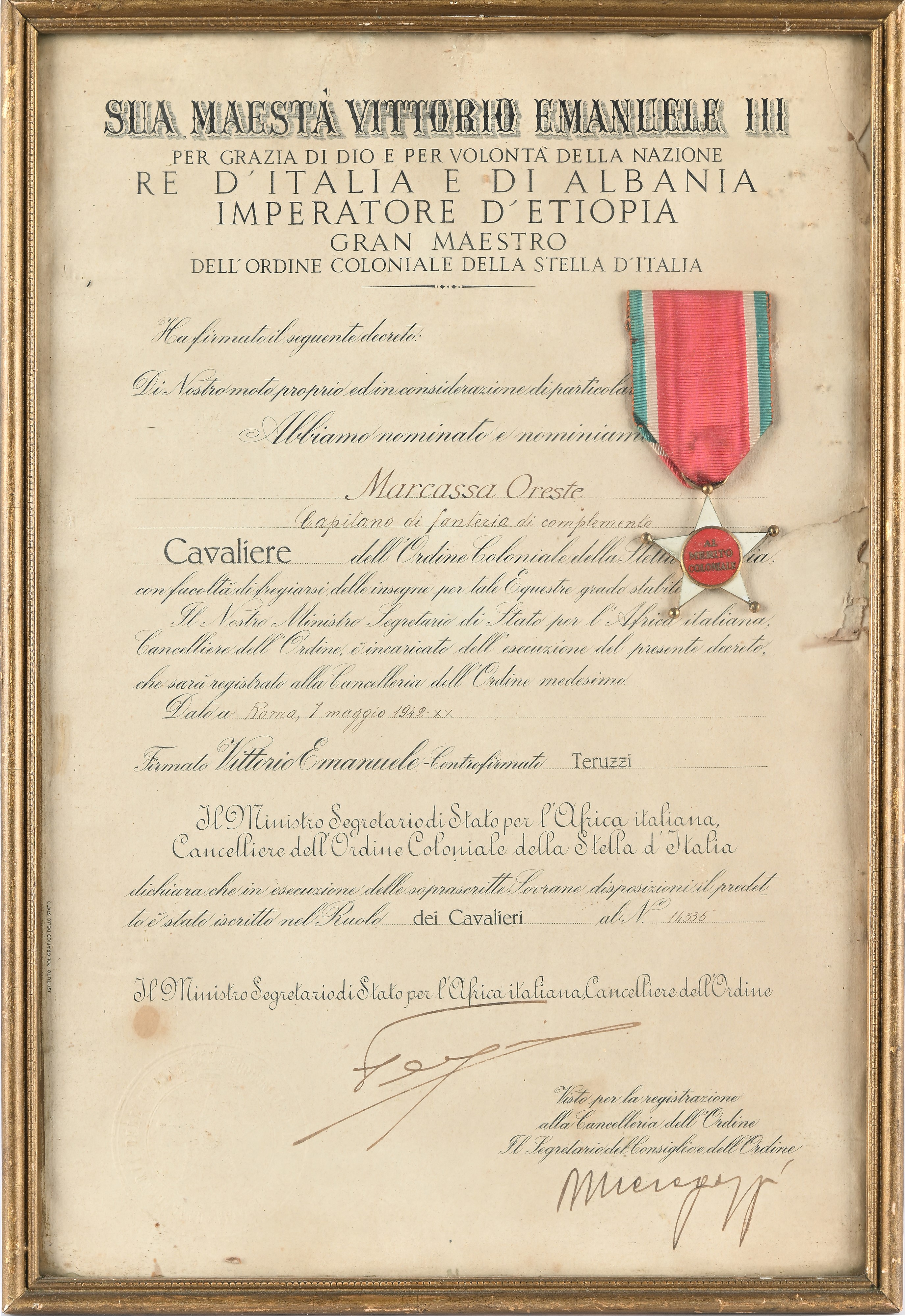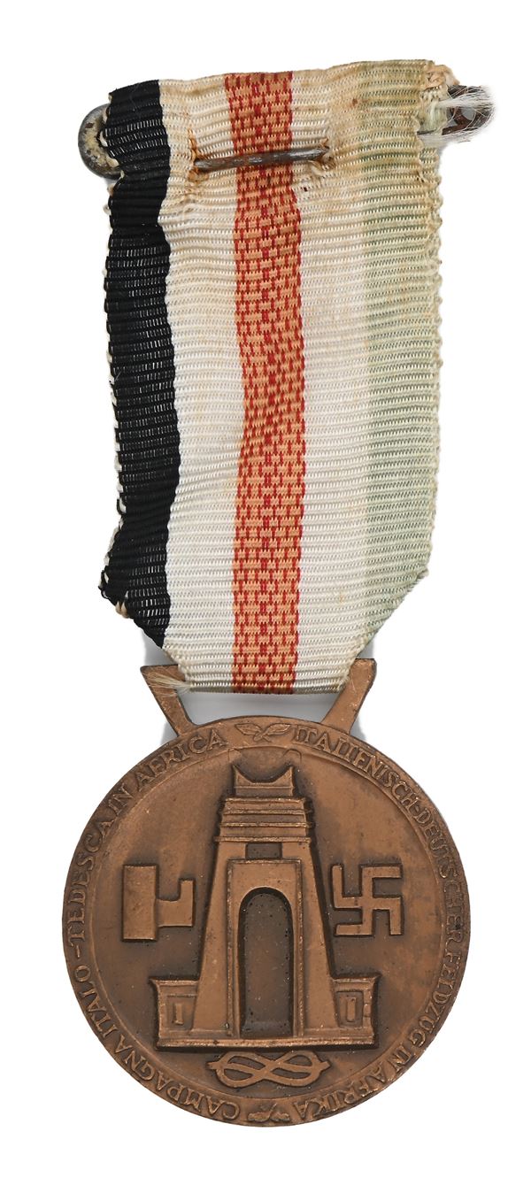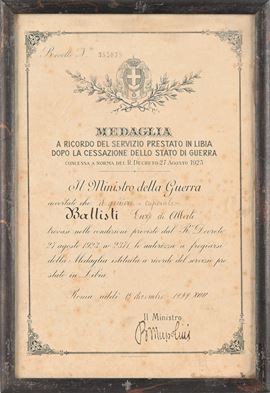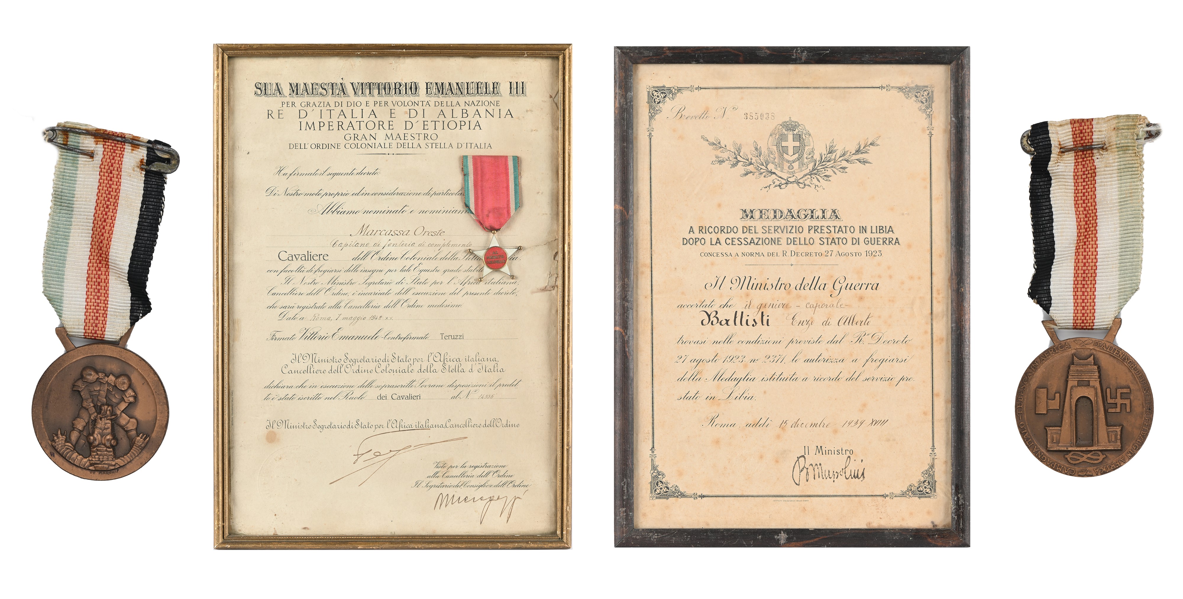 Insegna da Cavaliere dell'Ordine coloniale della Stella d'Italia in metallo dorato e smaltato con nastrino e Diploma allegato; Medaglia in bronzo con nastrino della Campagna Italo Tedesca in Africa; Diploma della Medaglia a ricordo del Servizio prestato in Libia