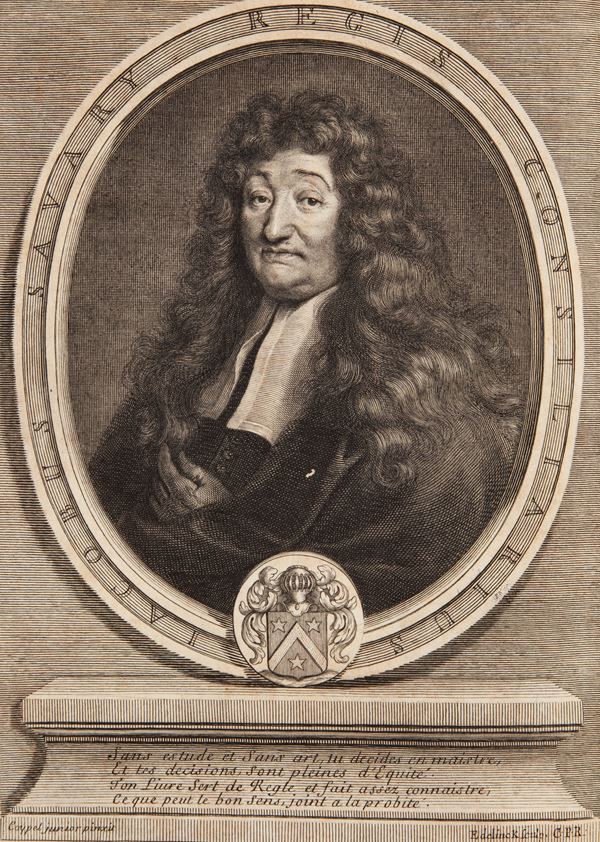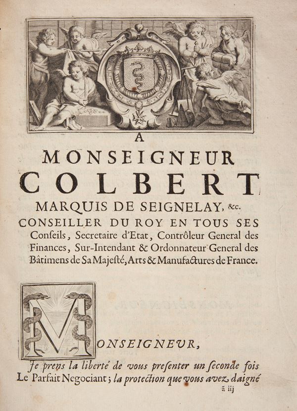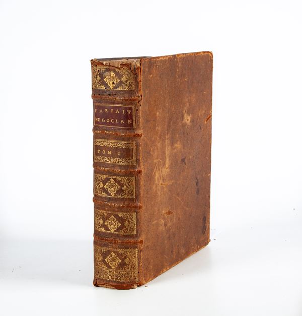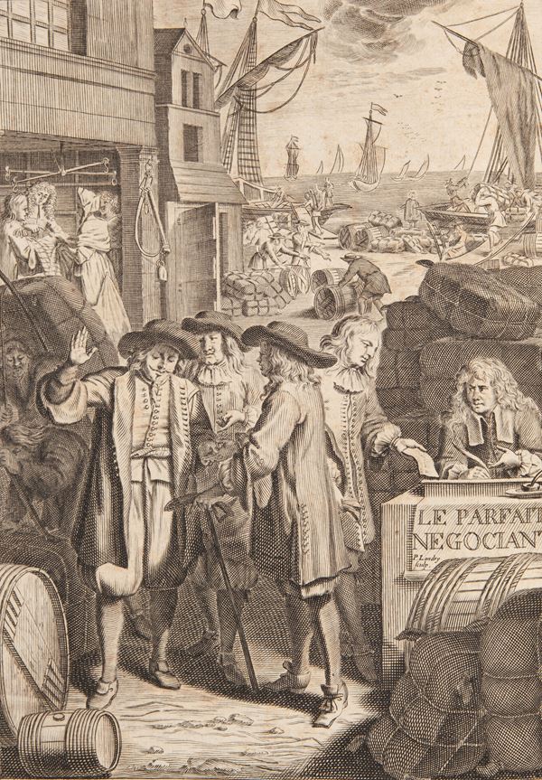 In 4° Tomo Primo Completo. Interessante trattato (apparso in prima edizione nel 1675) sui sistemi dei cambiavalute, sulle banche, sui negozi e commercio, l'industria, le assicurazioni, il diritto, la contabilità, la pesca, la navigazione, il trasporto illustrato con un'incisione in antiporta di Edelink raffigurante il Ritratto dell'autore (tra i più autorevoli economisti francesi del XVII secolo) e una tavola a piena pagina di Pierre Landry con una scena di commercio tra mercanti presso un porto. Legatura coeva in piena pelle a 5 nervi con titoli e fregi in oro al dorso