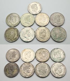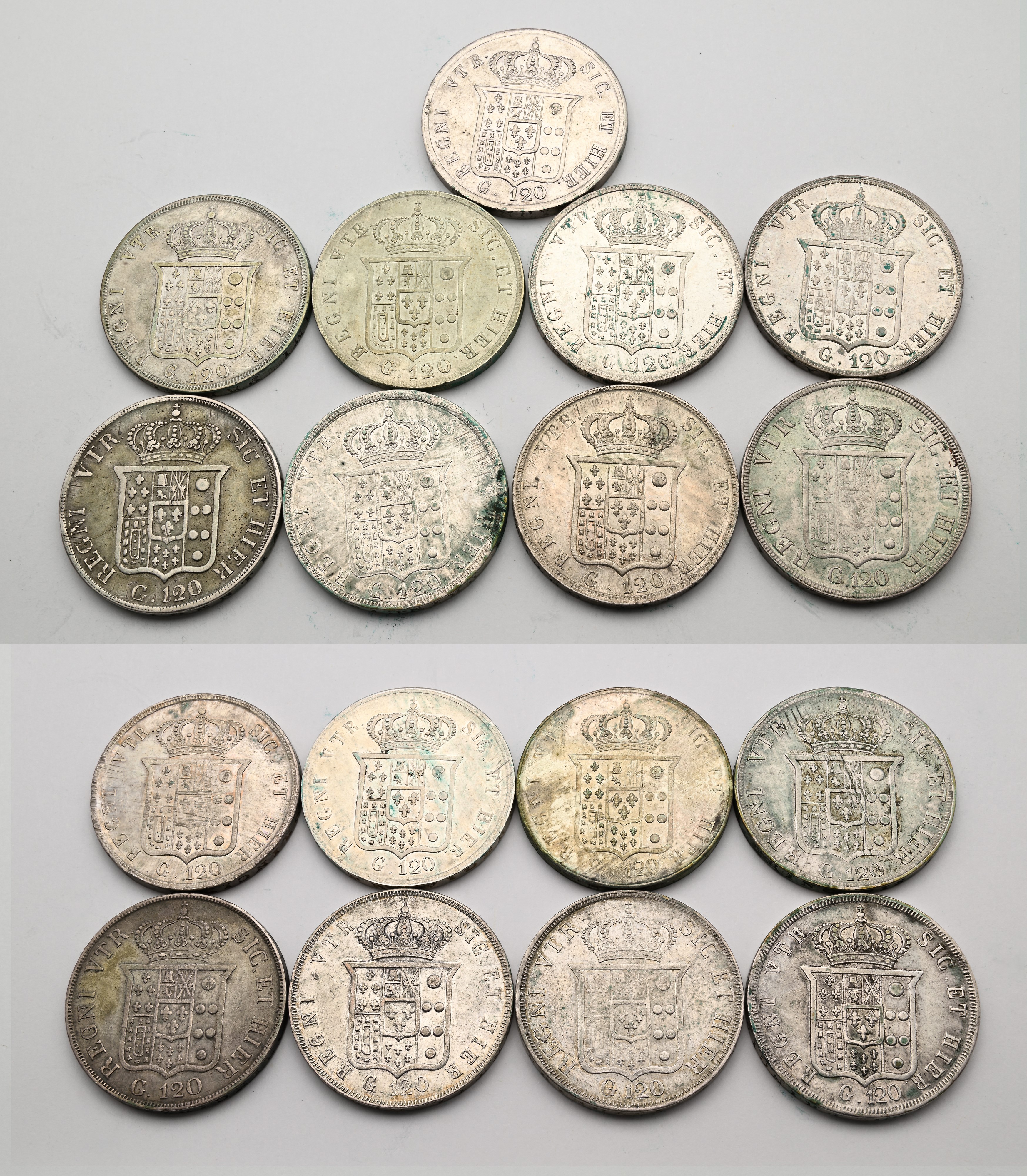 Lotto 17 Piastre da 120 Grana di Ferdianando II di Borbone: del 1° tipo 1831, 1833, del 2° tipo 1835, 1836, 1838, del 4° tipo 1843, 1844, 1846, 1848, 1850, del 6° tipo 1851, 1853, 1854, 1856, 1857 (2) e 1859