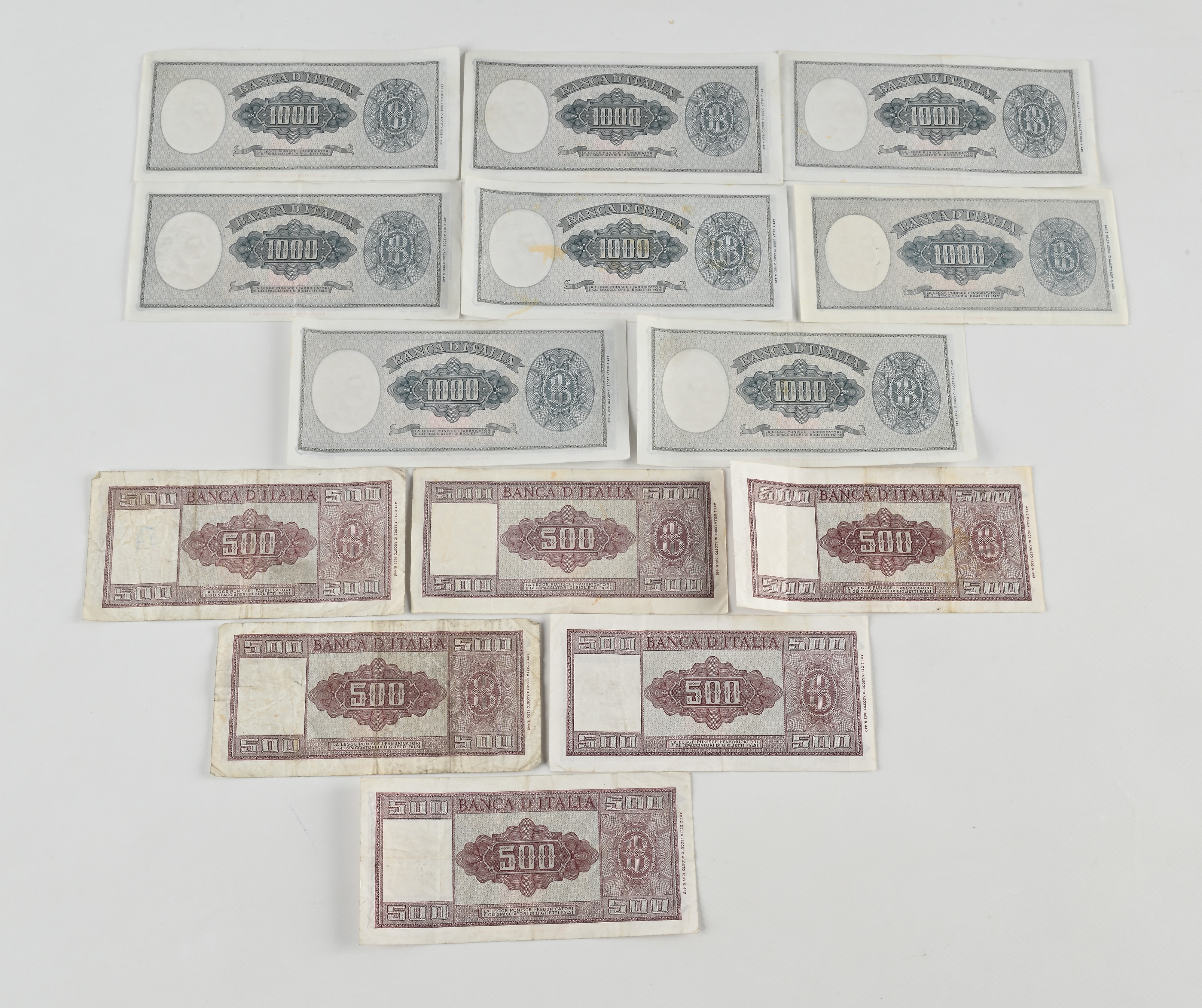 Lotto 8 banconote 1.000 Lire Italia ornata di perle: 1 Decreto 14 e 16 agosto 1947 Einaudi (20 marzo e 15 marzo 1947); 7 Decreto 14 agosto 1947 Carli (23 settembre e 14 settembre 1961). E 6 banconote 500 Lire Italia ornata di spighe: 1 Decreto 14 e 18 agosto 1947 Einaudi (20 e 15 marzo 1947); 5 Decreto 14 agosto 1947 Carli (23 marzo 1961 9 febbraio 1948). Più altre 16 banconote Vittorio Emanuele III, Luogotenenza e Occupazioni militari in Italia
