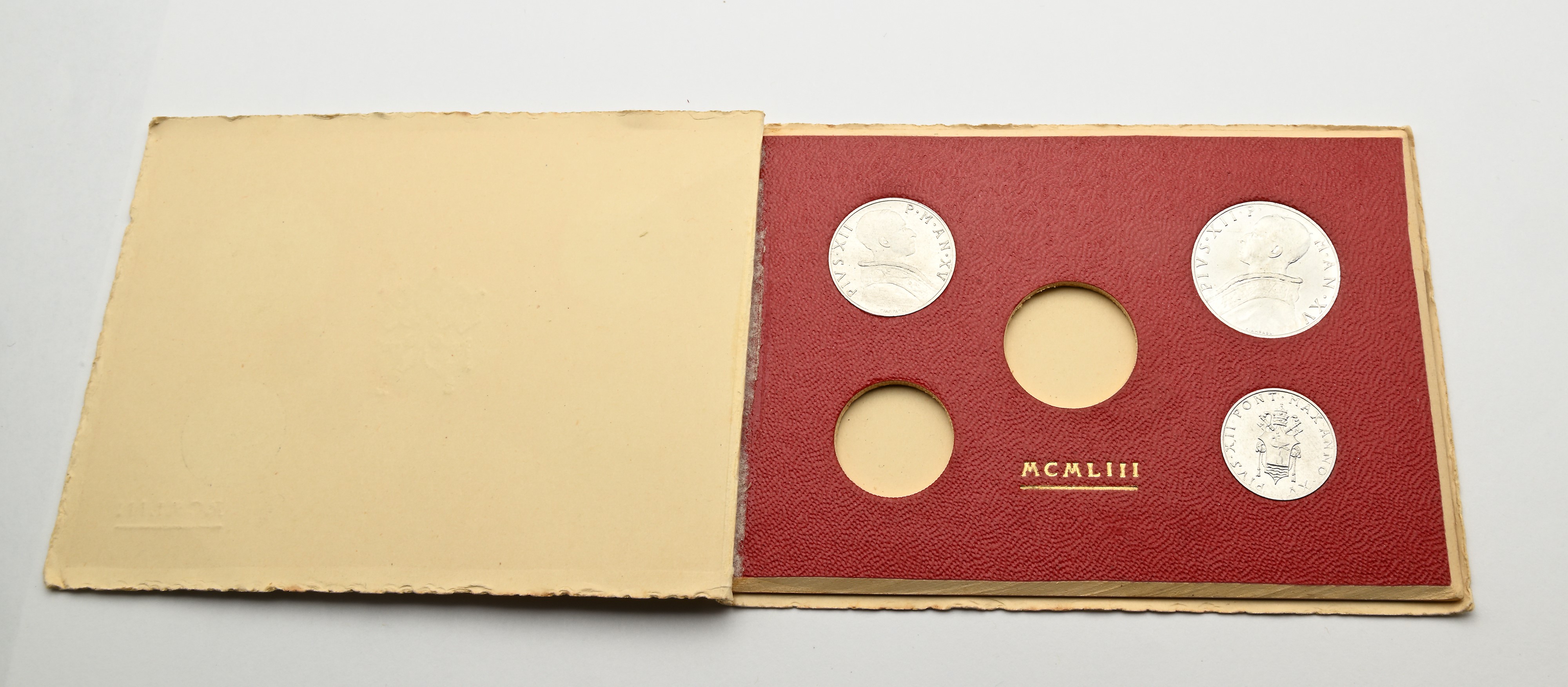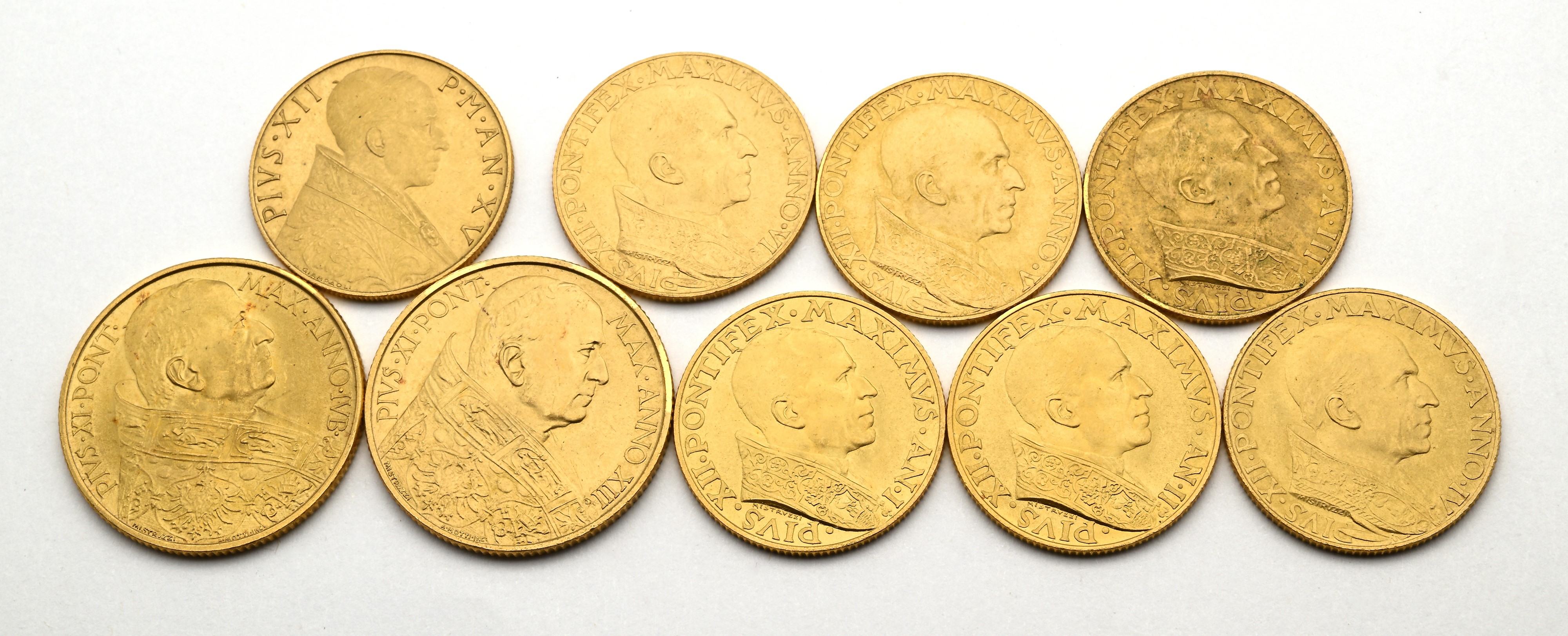 Lotto 9 monete da 100 Lire 1933-34, 1934 Pio XI; 1939, 1940, 1941, 1942, 1943, 1944, 1953 (entro serie completa mancante del 2 Lire in confezione originale) Pio XII Città del Vaticano