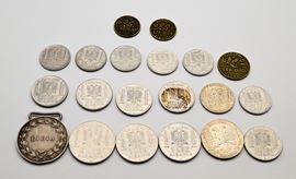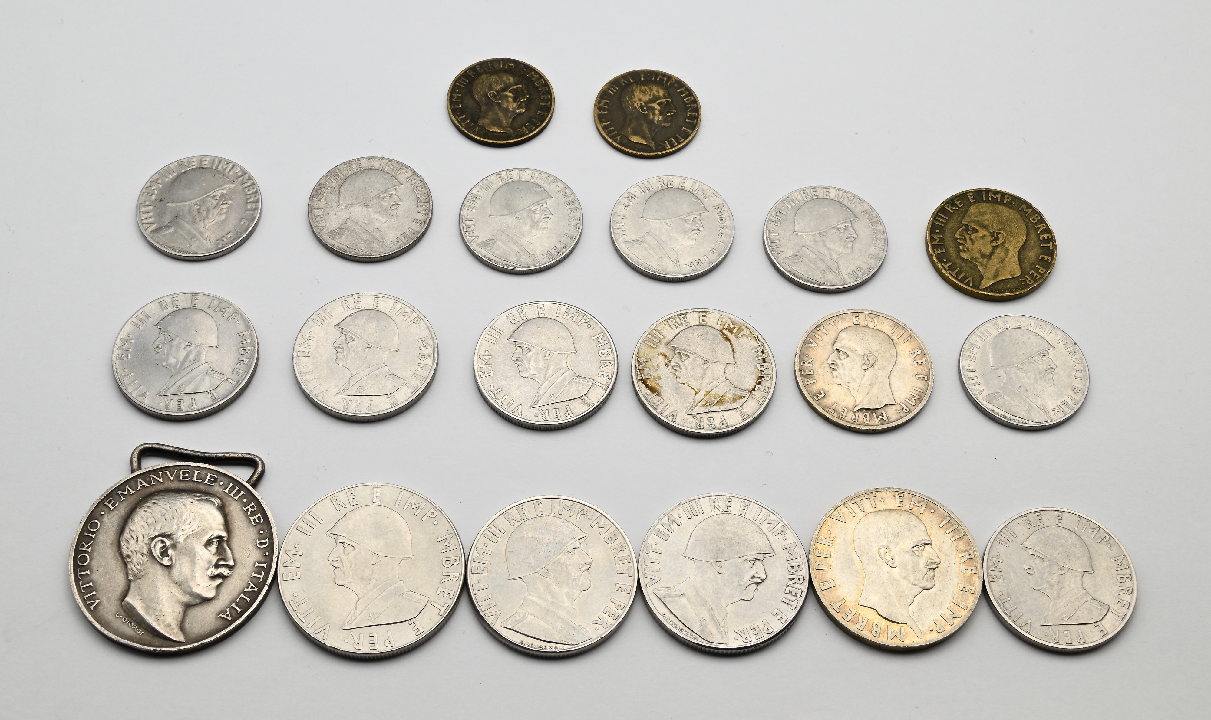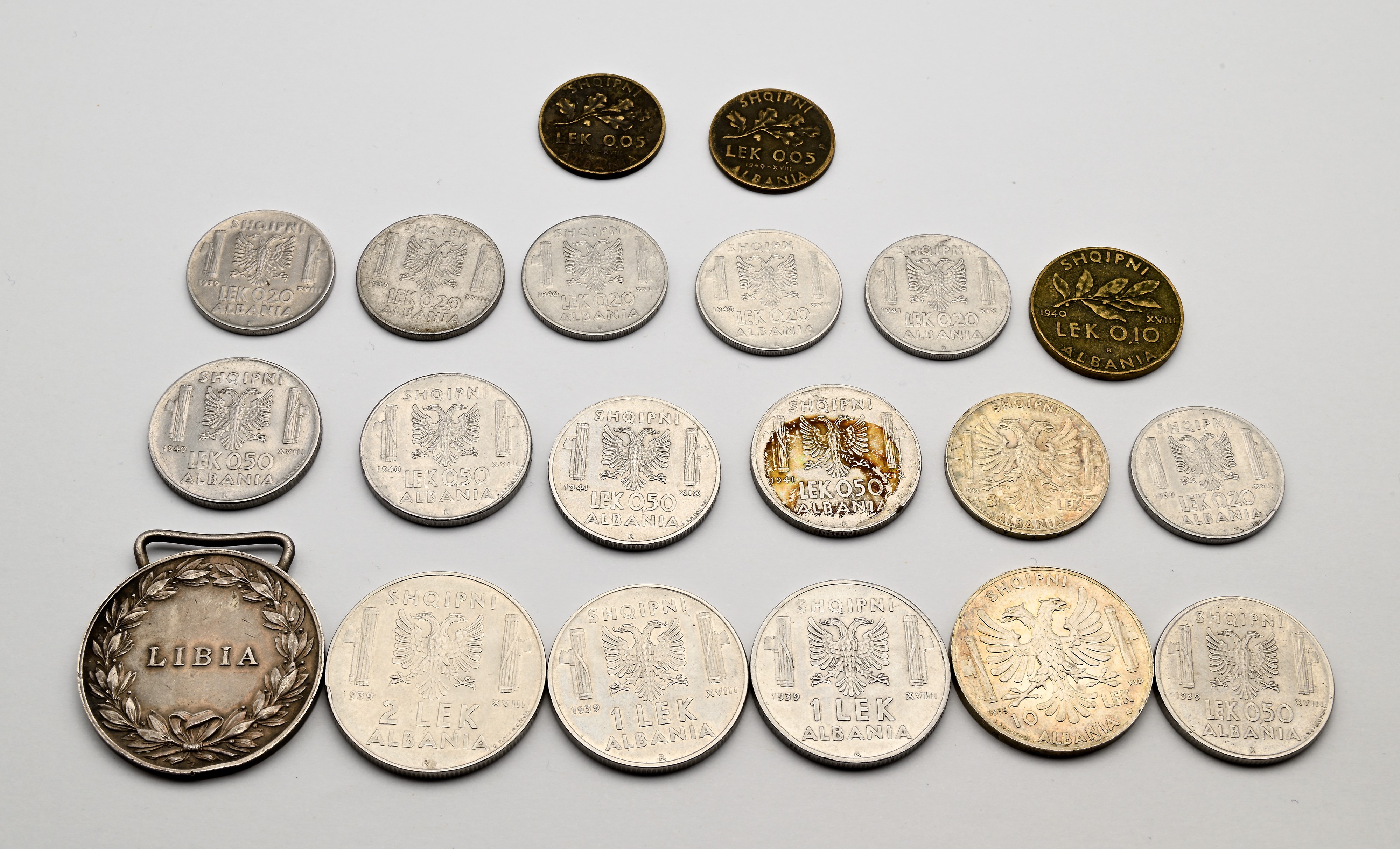 Lotto Albania Italiana: 5 e 10 Lek 1939 XVII, 2 Lek, 1 Lek (2) 1939 XVIII, 0,50 Lek 1939 XVIII (2), 1940 XVIII (2), 1941 XIX, 0,20 Lek 1939 XVIII (3), 1940 XVIII (2), 1941 XIX, 0,10 Lek 1940 XVIII, 0,05 Lek 1940 XVIII (2) e una medaglia Libia in argento Vittorio Emanuele III